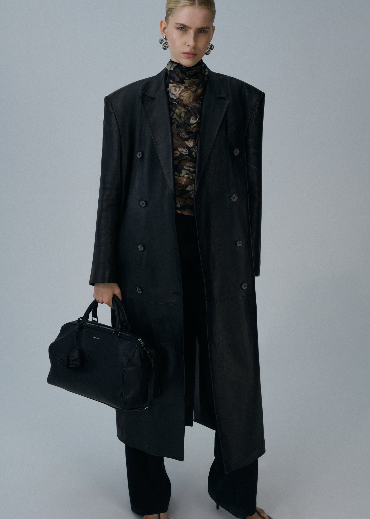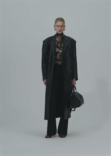 A classic double-breasted coat that hits at the ankle, made in leather with a special coating to give it a shine effect.