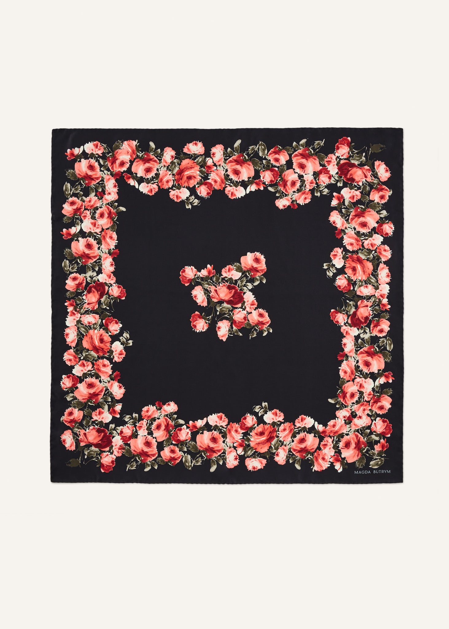 This black scarf features a beautiful floral motif. Crafted from silk, it’s the perfect addition to elevate any look.