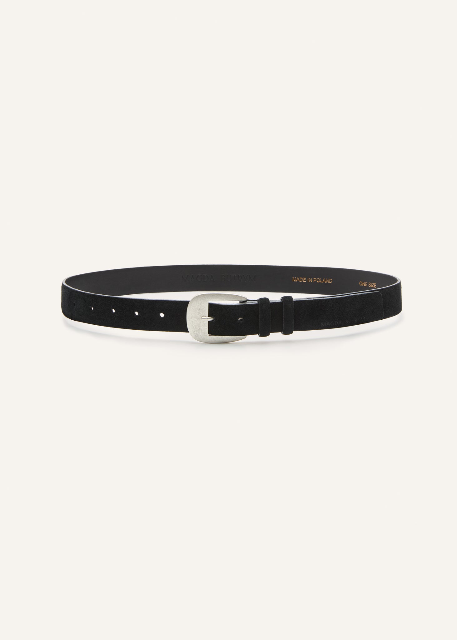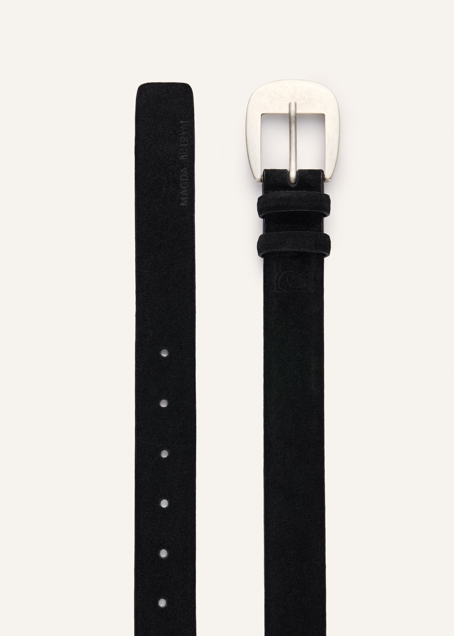 A suede black leather belt featuring a brushed silver buckle with a softly squared silhouette.