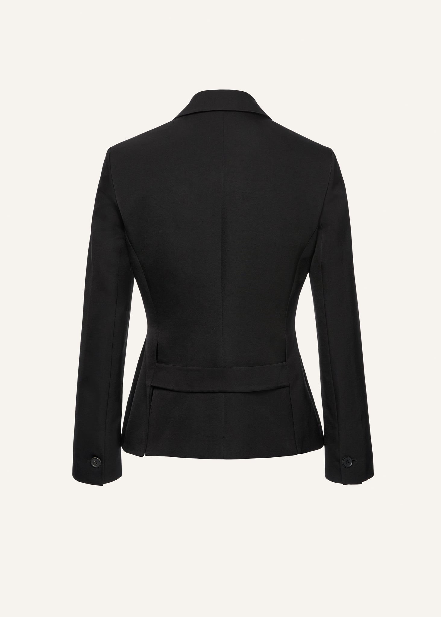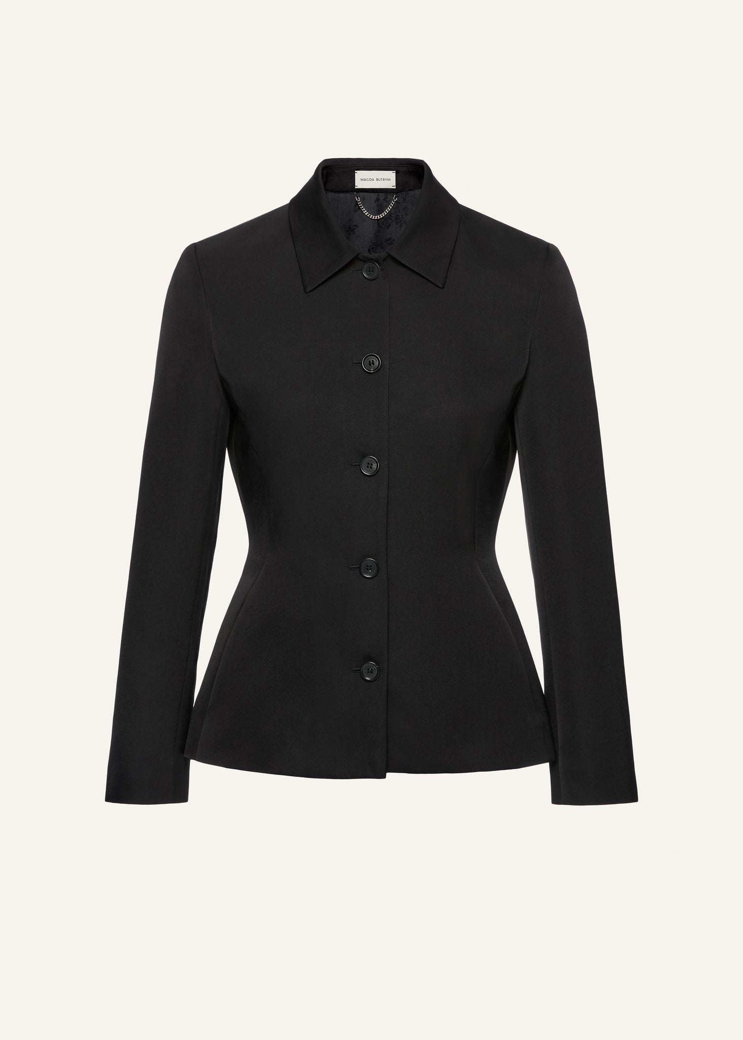 This fitted blazer is crafted from a luxurious blend of cotton and cashmere and tailored to subtly enhance the natural waist, creating a soft hourglass silhouette. It features a classic shirt-style collar, button-down front, and structured shoulders, combining timeless elegance with modern precision.