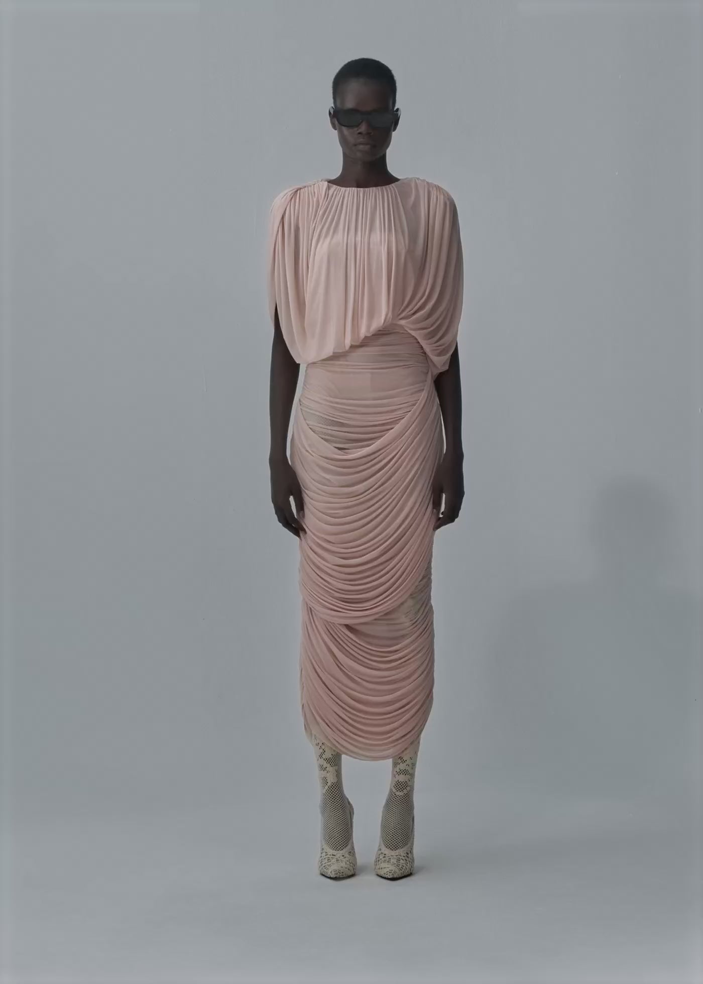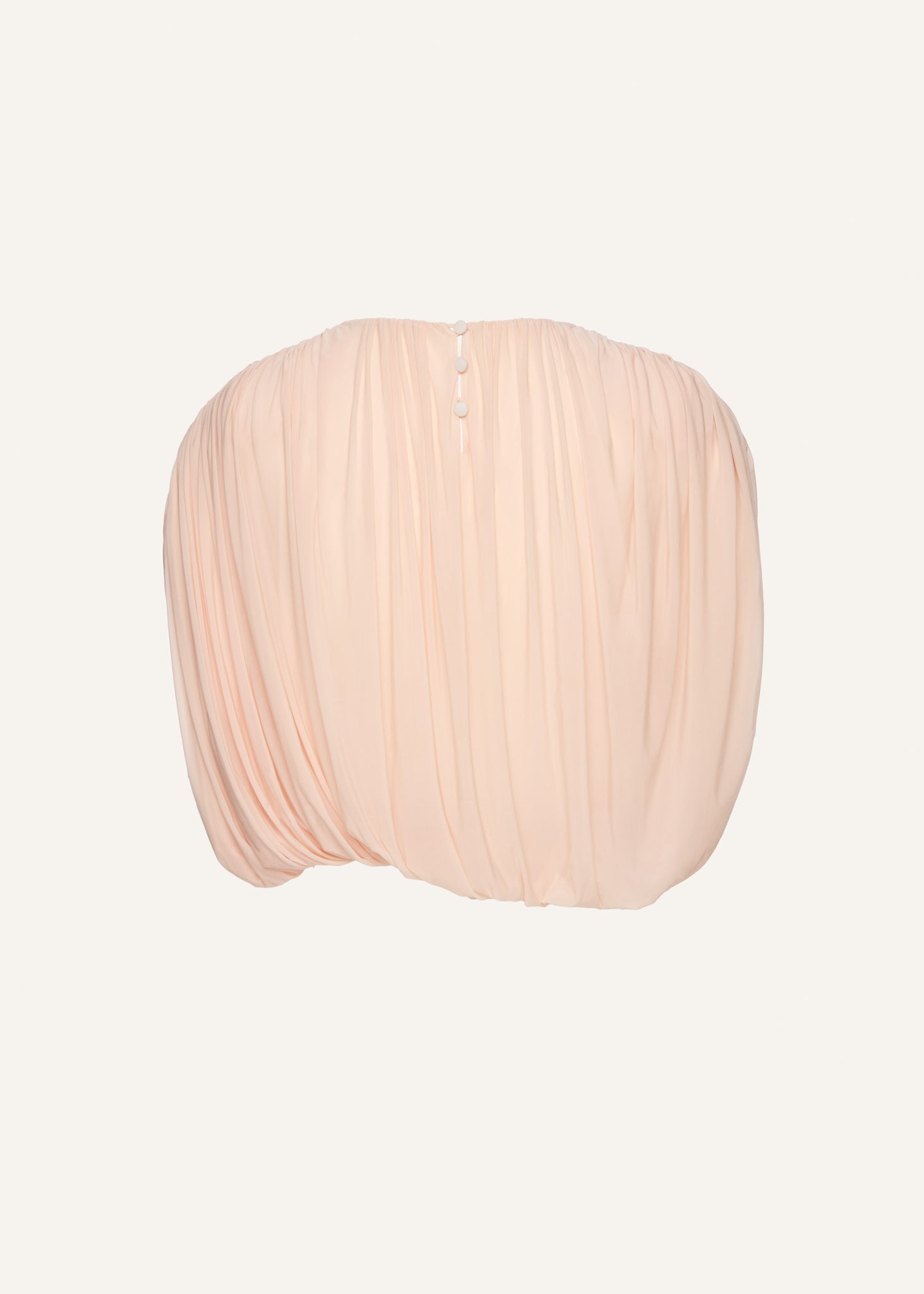 A sleeveless top with a round neckline and voluminous silhouette, created by heavy ruching at the shoulders and hem. Structured with shoulder padding and a gathered bubble hemline. The hem is cinched with elastic band.