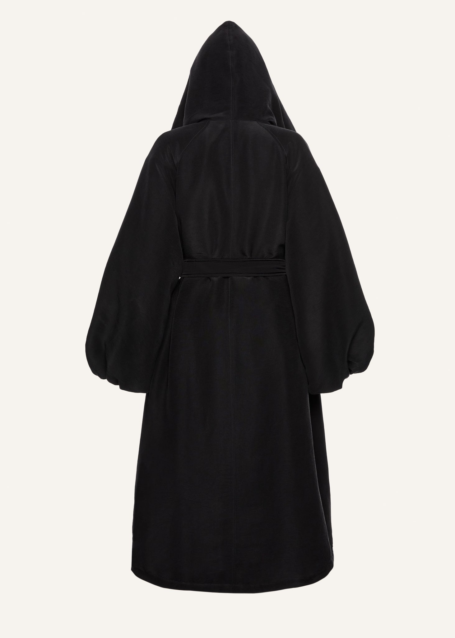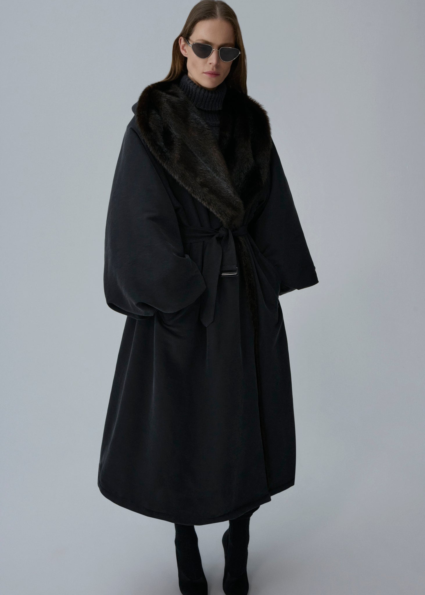 A winter-ready statement piece, this long coat is crafted from silk and fully lined in faux fur. Designed with voluminous sleeves that gather at the cuff, it features a hood and waist-cinching belt in place of traditional closure. Functional front pockets complete this elevated, cocoon-like silhouette.