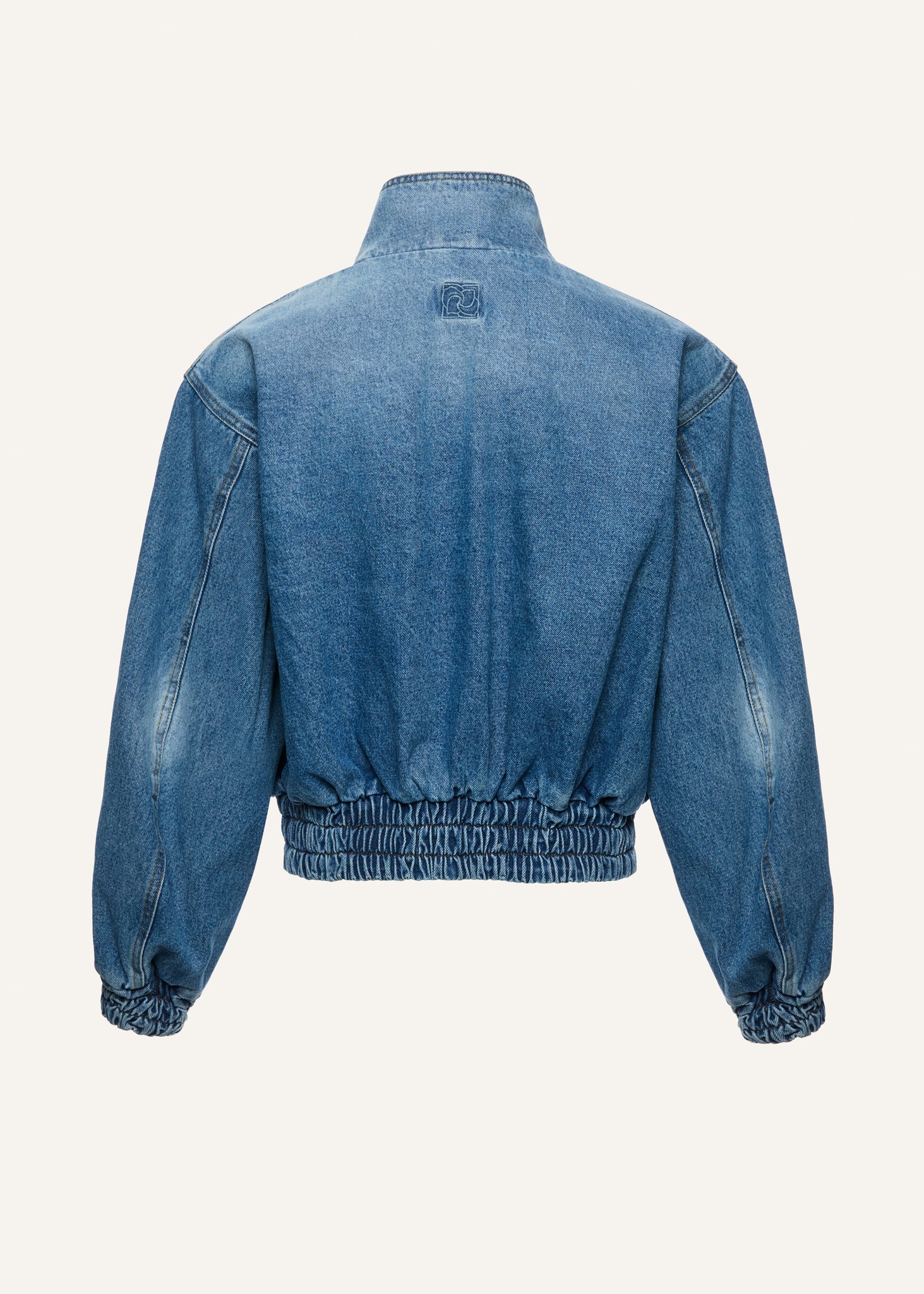 This modern bomber silhouette is reimagined in a structured vintage-wash denim with elasticated cuffs and hem for a cinched effect. Featuring a high snap-button collar, oversized flap pockets, and a front zip closure, the design offers a bold yet practical statement. A subtle embroidered logo at the back neck adds a signature touch. Both fashion-forward and functional, this jacket is perfect for layering through the seasons.