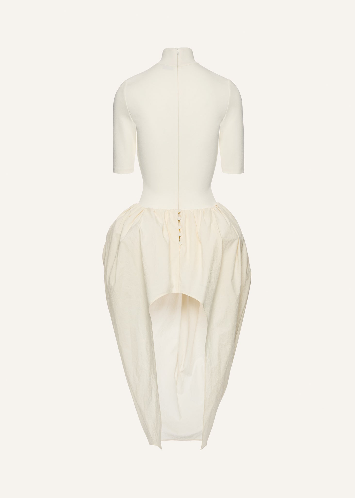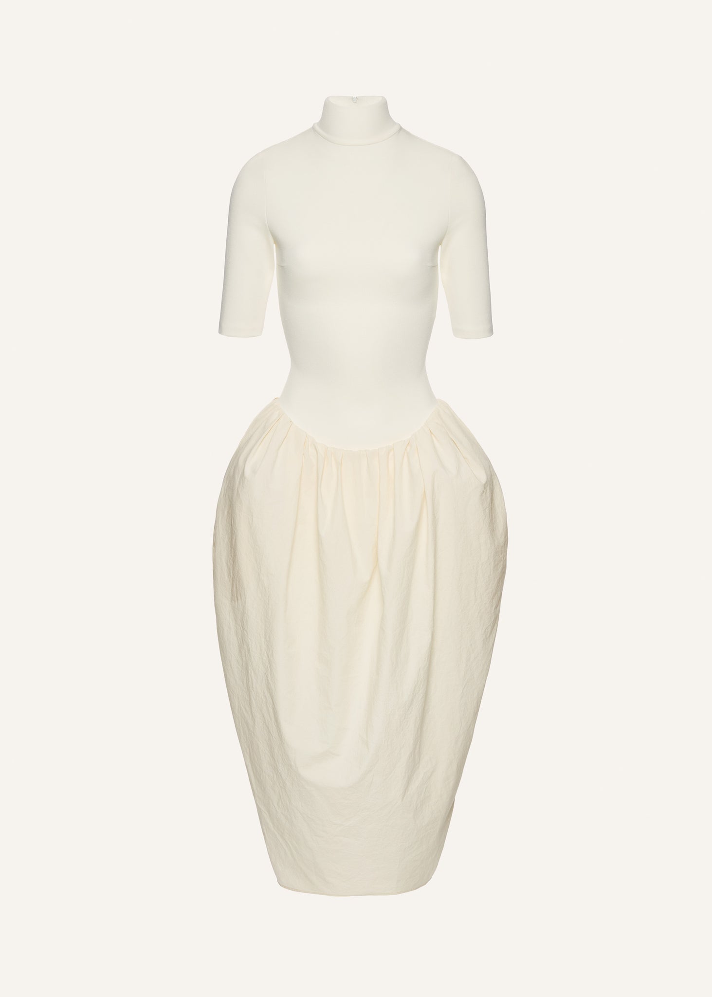 A form-fitting midi dress that combines a structured silhouette with dramatic volume. It features a sleek turtleneck and fitted 3/4 sleeves, contrasted by a voluminous skirt with a high slit at the back. The bodysuit base fastens underneath the skirt.