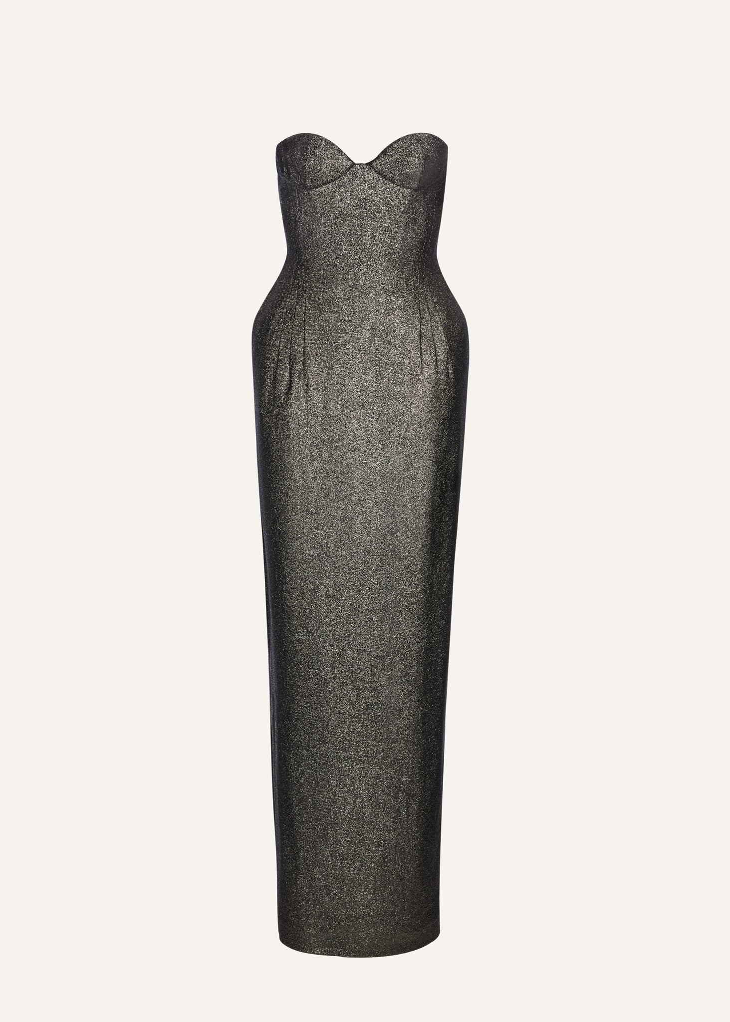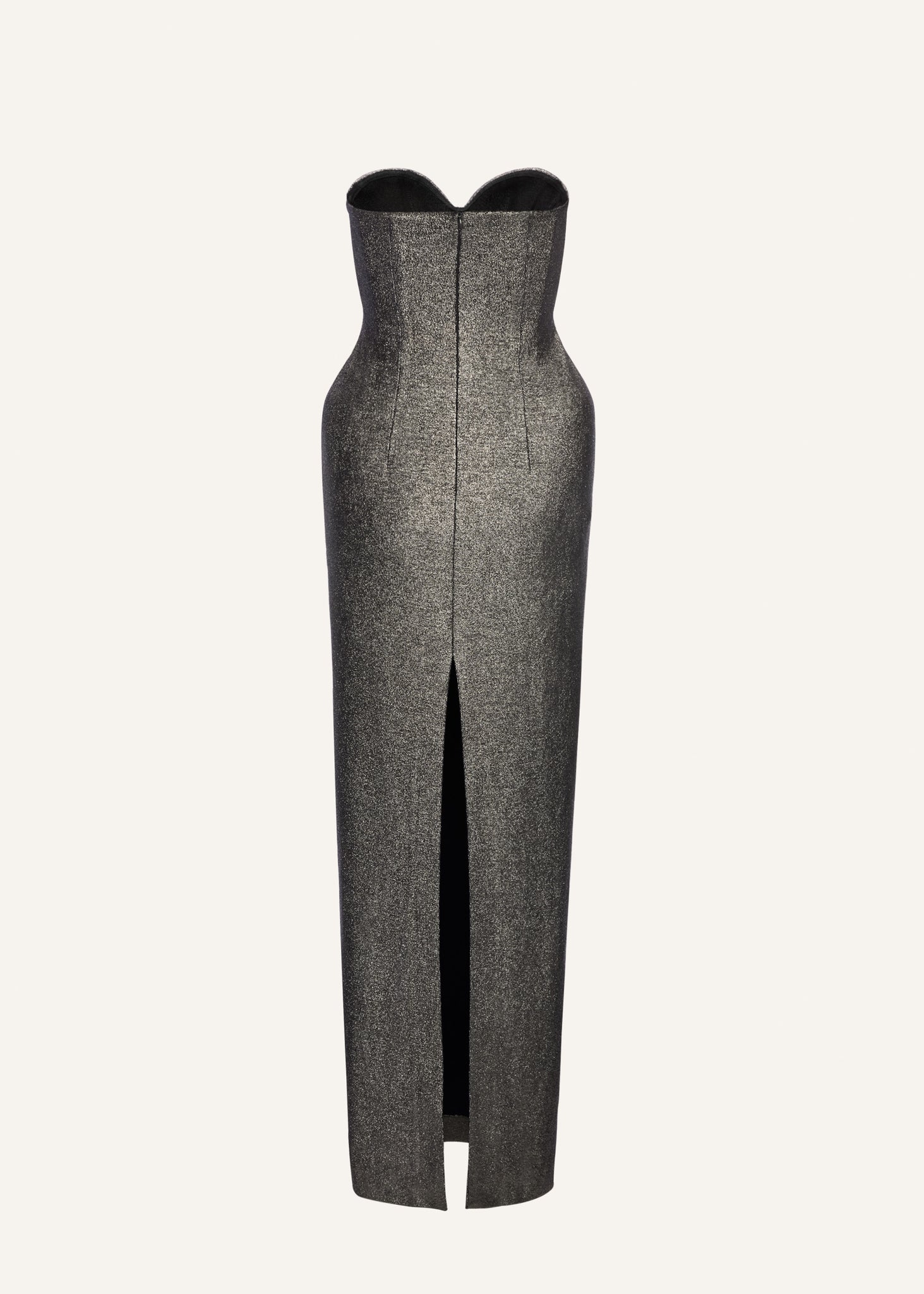 This sculptural strapless maxi dress is cut close to the body with exaggerated padded hips that create a dramatic hourglass silhouette. Made from shimmering graphite, the fitted shape is finished with a sweetheart neckline and back slit for movement.