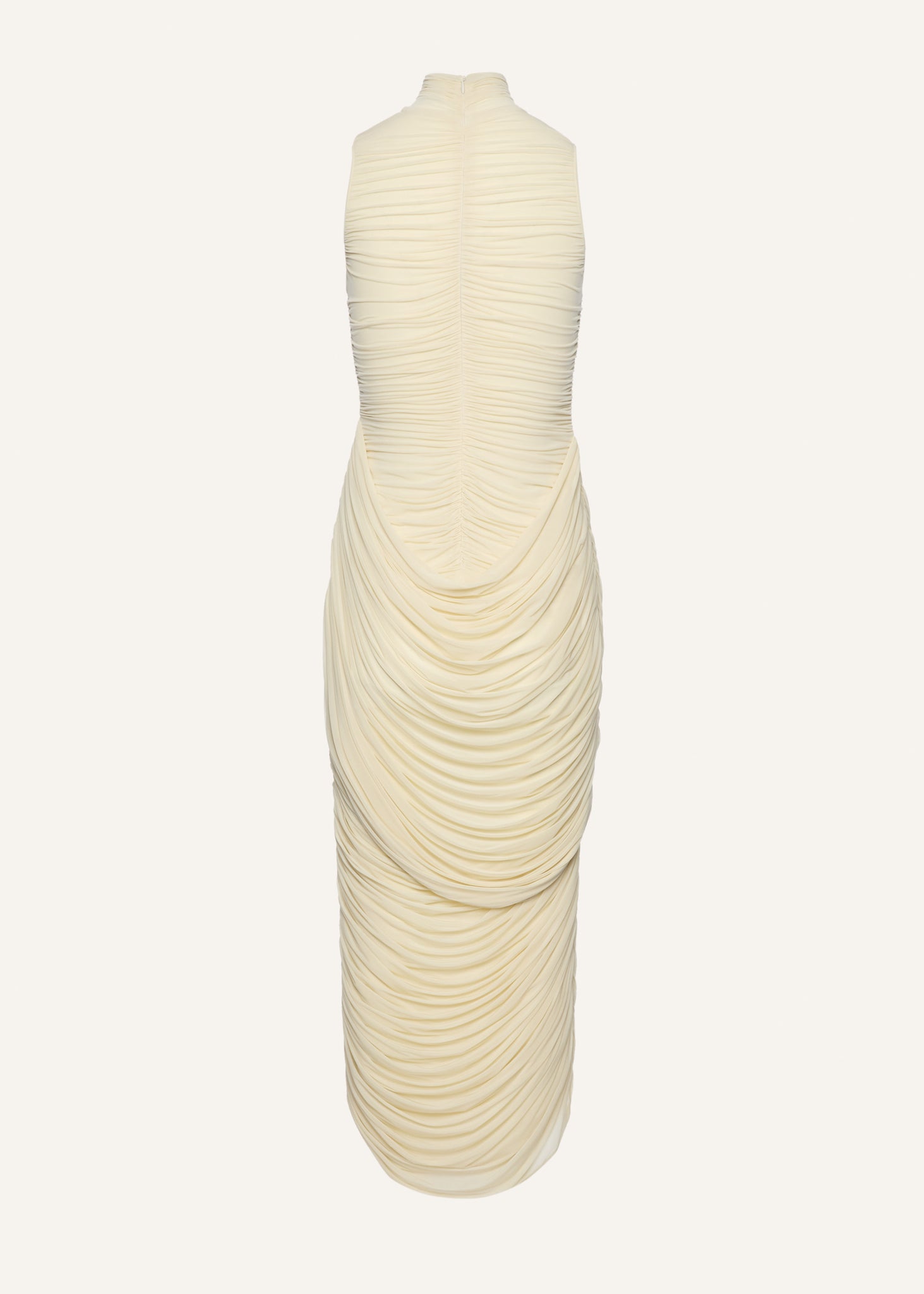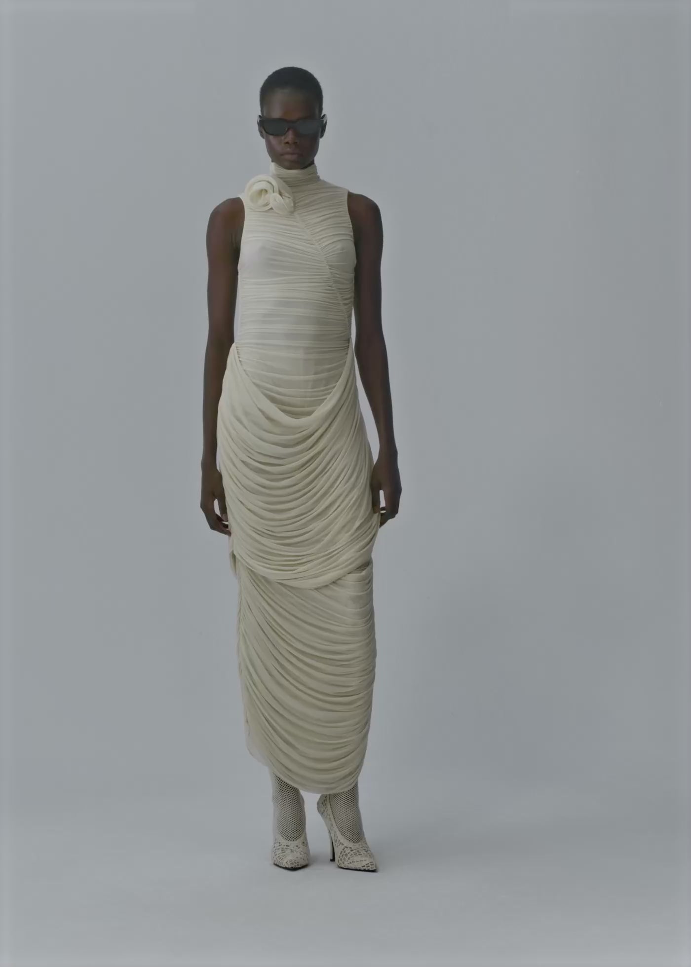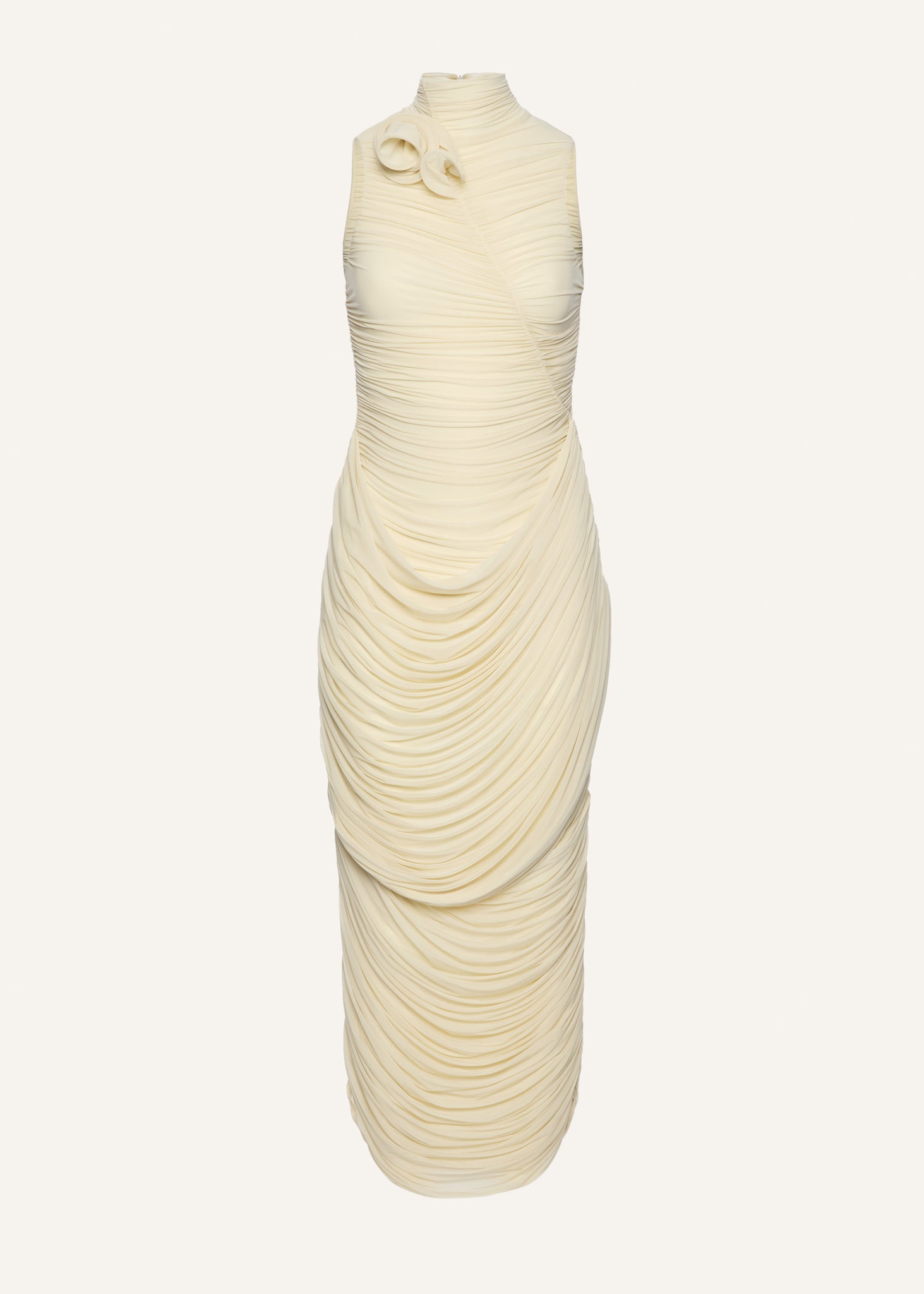 This sleeveless maxi dress features a ruched high neckline and sculptural floral detailing at the front. Expertly draped throughout, with gathered seams at the sides, back, and hips, the silhouette is enhanced by layered ruching that adds dimension and movement. Finished with a concealed zip closure at the back and an interior bodysuit for structure and support