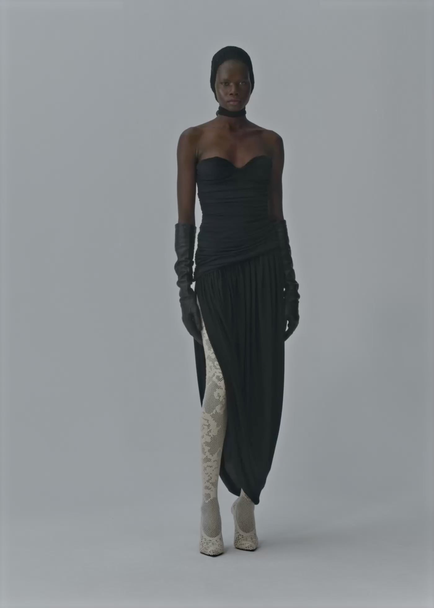 Open-leg draped maxi dress in black