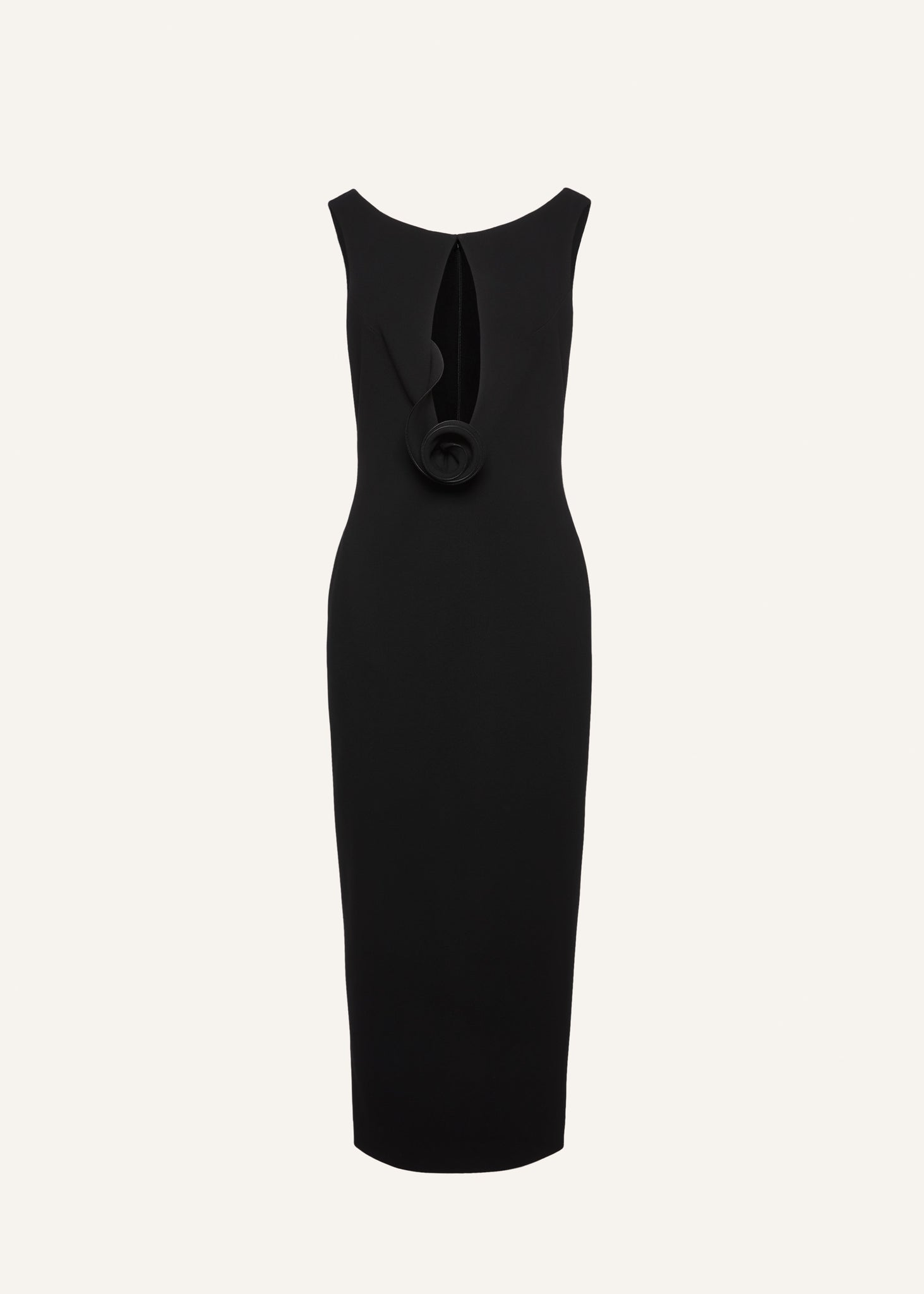 Midi dress featuring a keyhole neckline adorned with a floral appliqué. Crafted with a sleek silhouette, complete with discreet side pockets and a back zip closure.