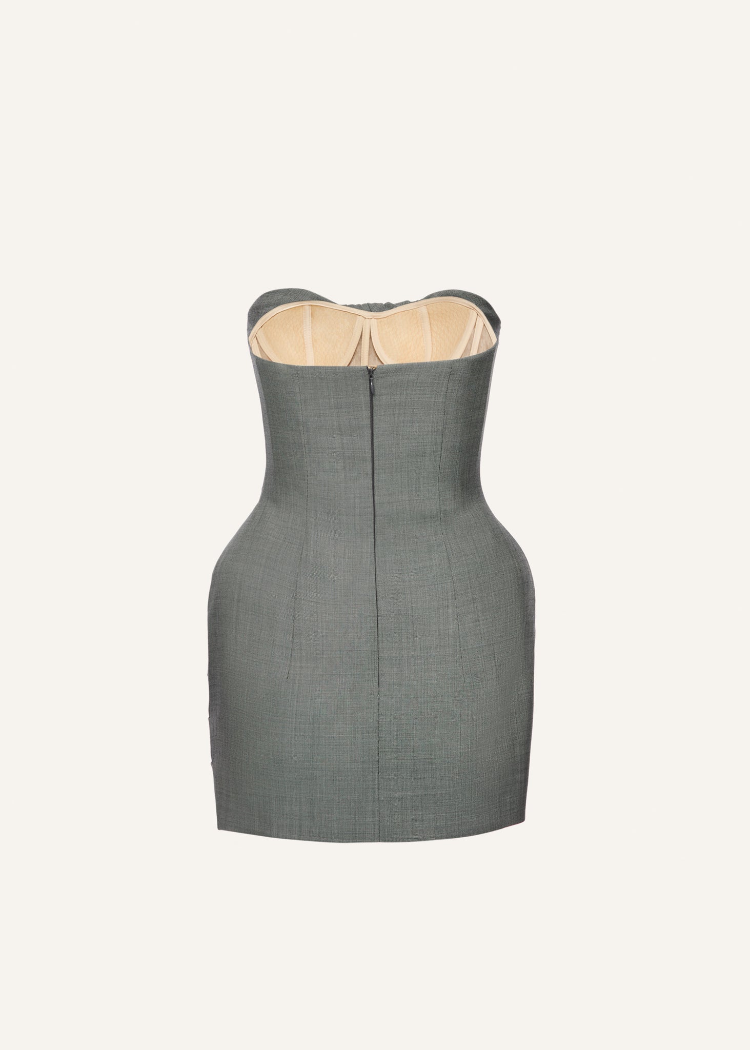 This mini corset dress features a structured bodice with intricate darting and sculptural draping across the bust and hip. Designed to accentuate the figure, the silhouette is enhanced with padded hips for subtle volume.