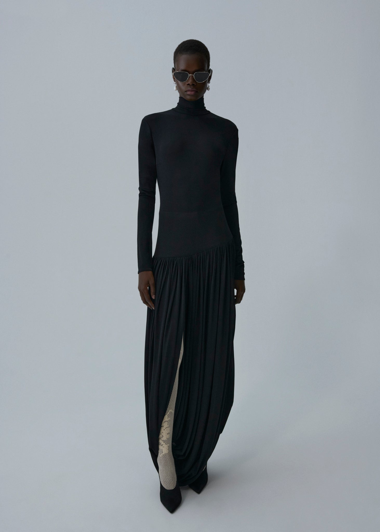 A long, figure-hugging gown with a high turtleneck collar and full-length sleeves. The sleek silhouette is contrasted by a voluminous draped skirt gathered at the hips, featuring open panels along the front and sides that add movement and a subtle reveal. Crafted with a stretch bodice and a lightweight draped lower half for a modern, fluid finish. Closed at the back with an invisible zip.