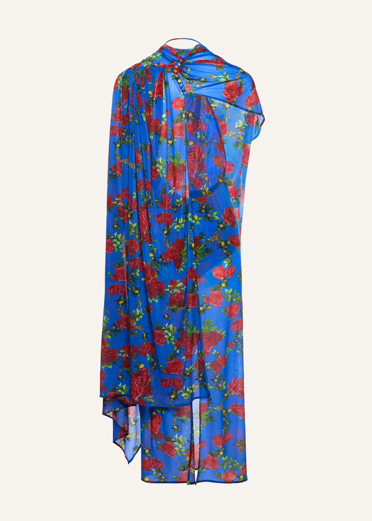 Crafted in a sheer floral print and designed with an asymmetric silhouette. Draped from the left shoulder, a long flowing scarf cascades dramatically down the body. The neckline features a soft cowl at the front, while the back reveals a deep, open décolletage finished with a delicately ruched collar. A built-in bodysuit, attached along the back neckline with thin straps, ensures a secure fit.