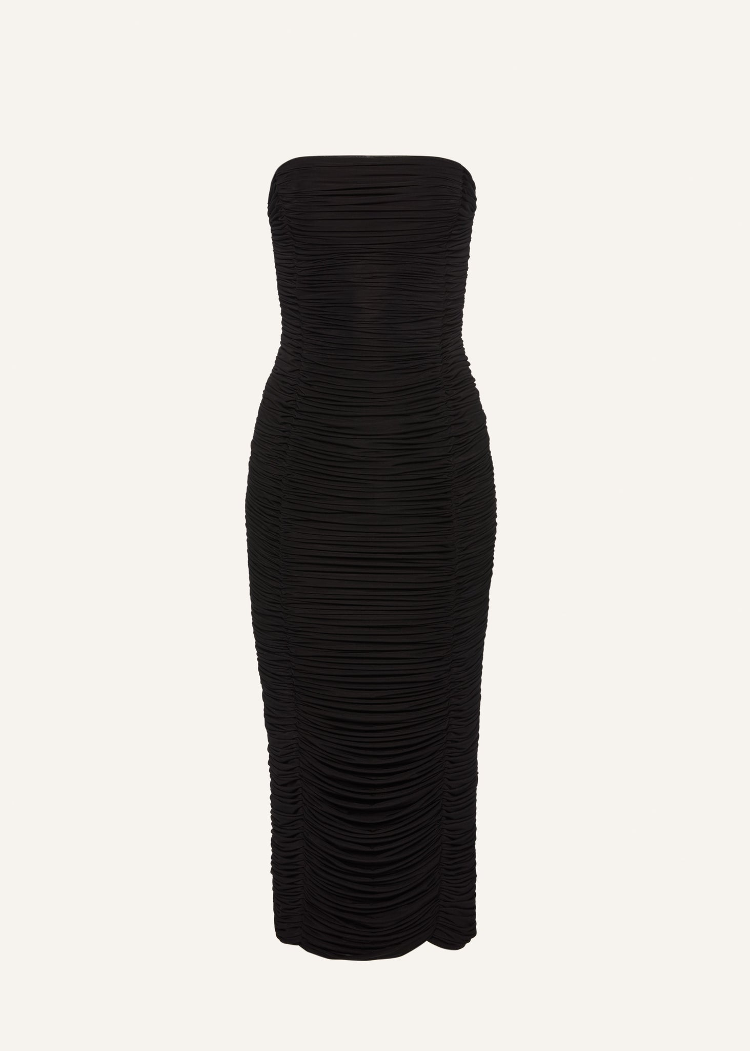 A figure-hugging strapless midi dress, crafted with a gathered structure that accentuates the silhouette. Vertical seams run down the front and back, each detailed with alternating decorative pleats that add depth and texture. The entire piece is fully lined for a smooth finish.