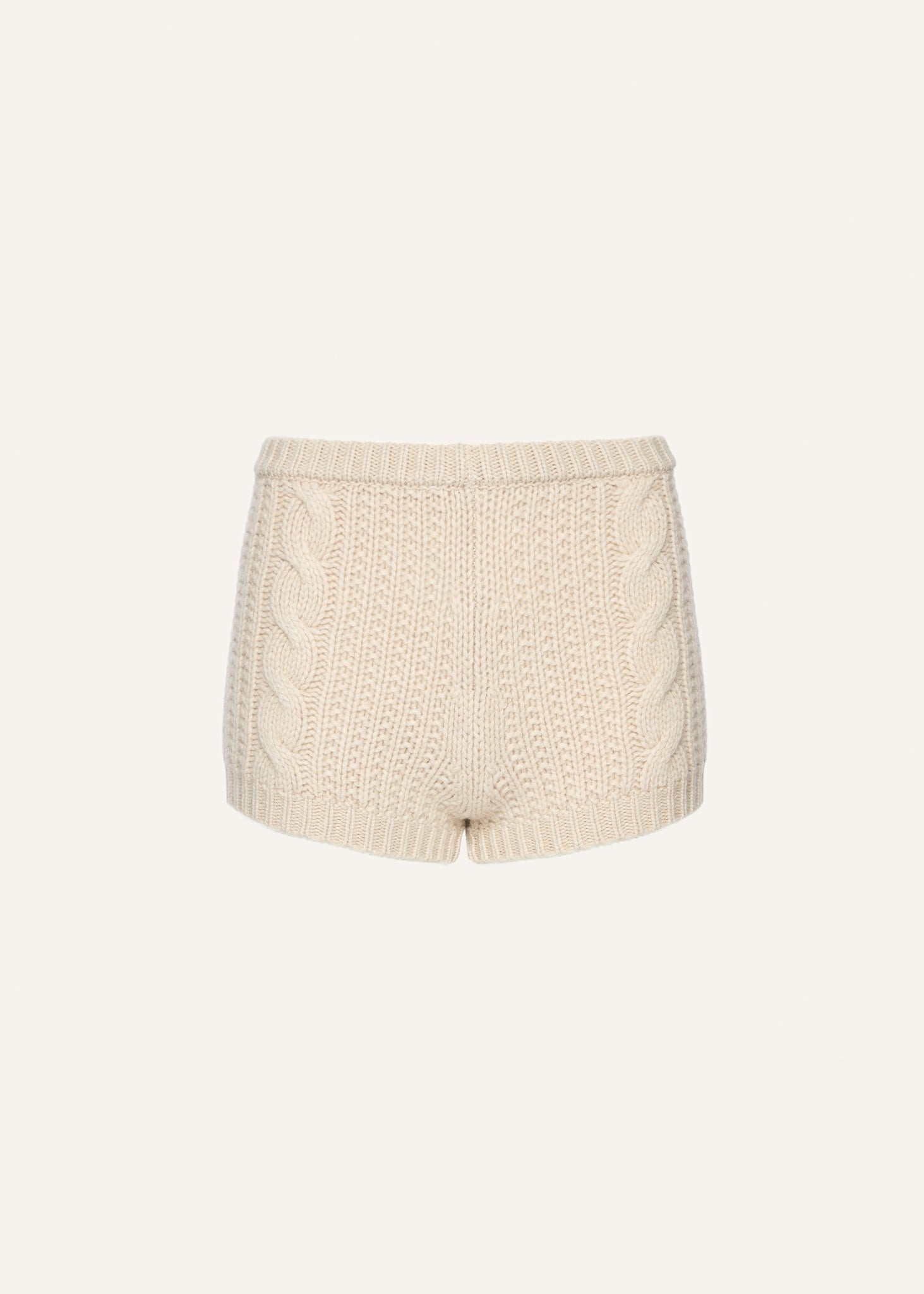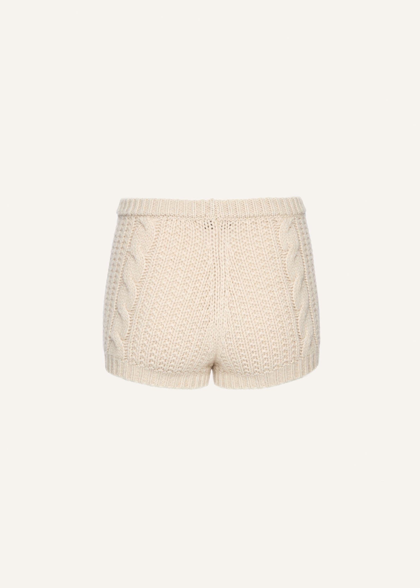 Soft, sculpted, and effortlessly luxe — these high-waisted shorts are spun from pure cashmere in a chunky cable-knit pattern. Featuring ribbed trims and a flattering close fit, they balance comfort with sensuality, making them perfect for layering or lounging. An elevated essential that redefines cozy sophistication.