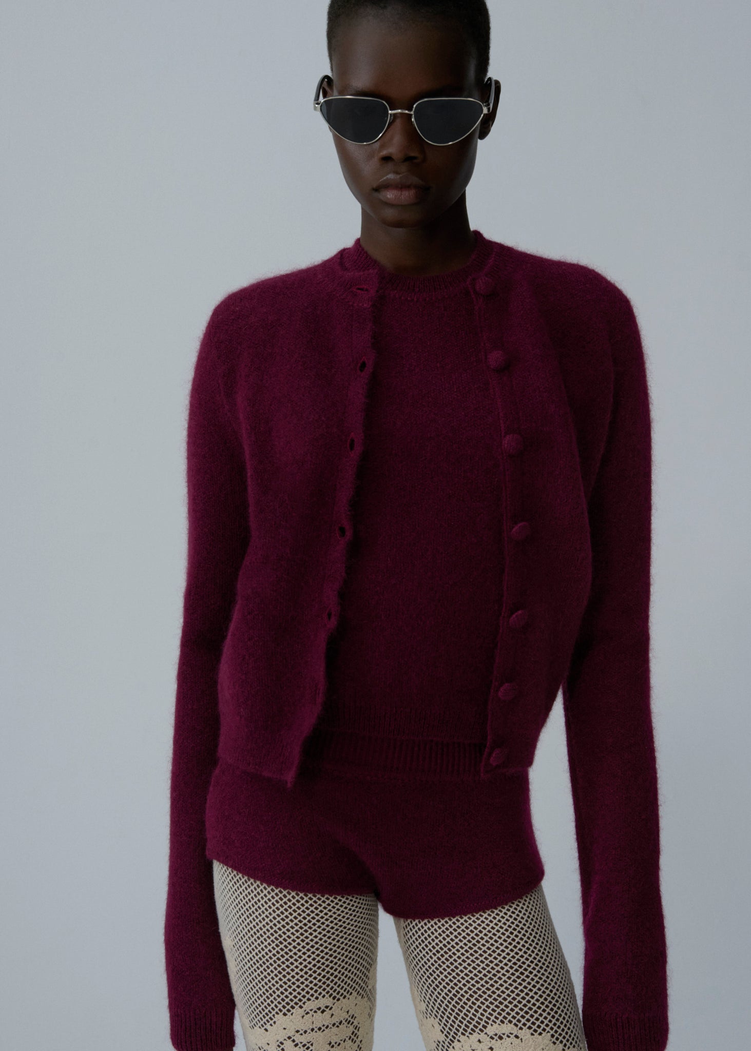 This mohair-blend knit top offers a cozy yet refined take on a wardrobe essential. The short sleeves and cropped silhouette make it ideal for layering or wearing solo. Designed with a classic crew neckline and ribbed trims for a clean finish.