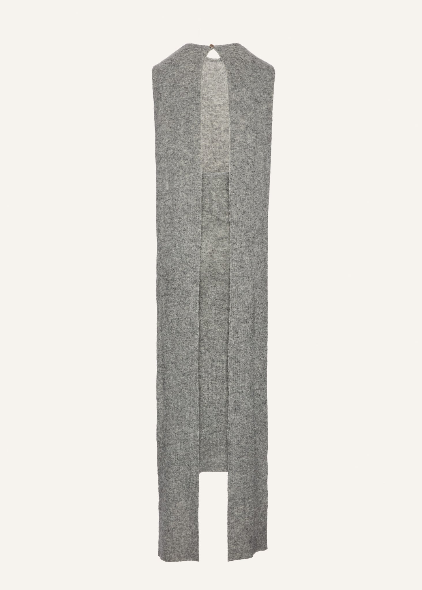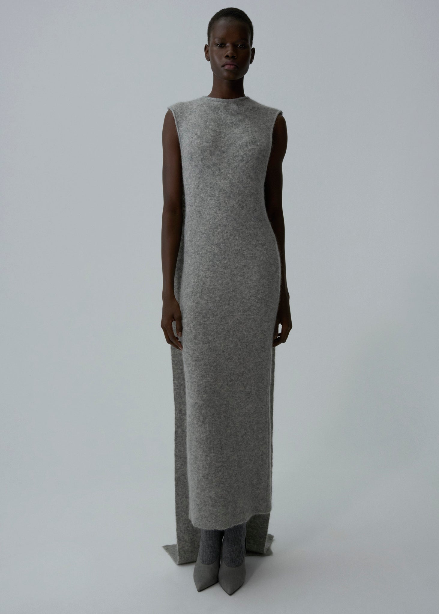 A statement silhouette rendered in soft brushed mohair, this sleeveless dress features a clean, columnar shape that hugs the body. Dramatic extended side panels cascade from the shoulders, adding fluidity and movement. Finished with a minimalist back keyhole closure, it merges sculpture and softness in one piece.