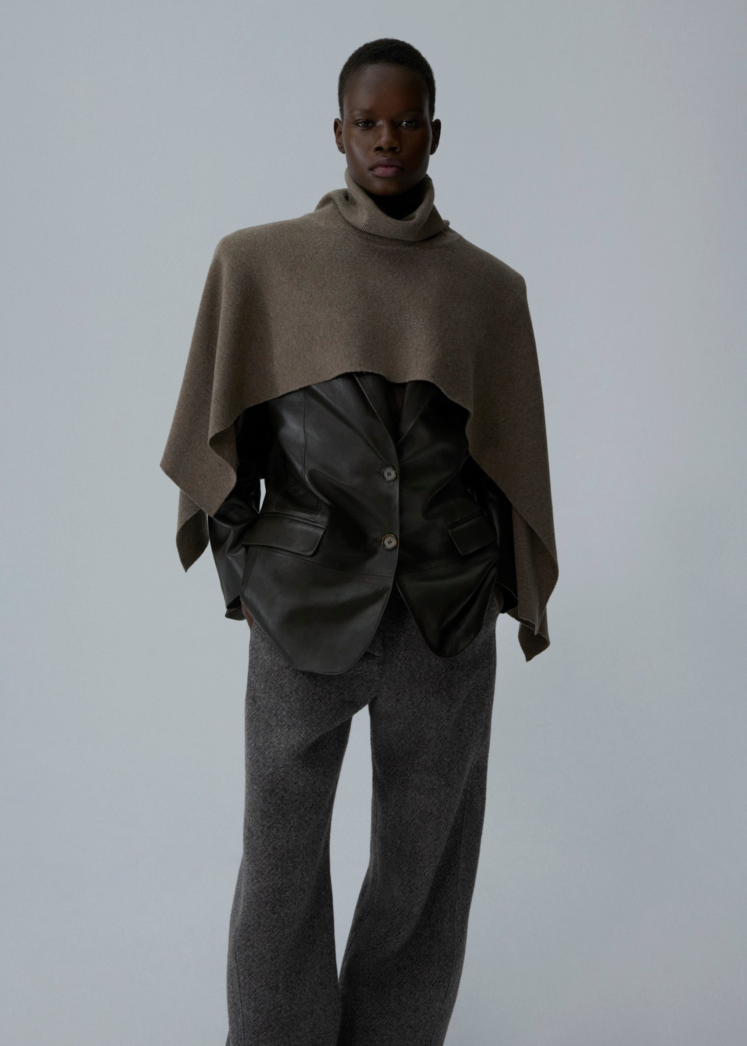 This cape features fluid panels that cascade over the arms, creating movement and volume while remaining lightweight and warm. Its asymmetrical hemline adds a touch of modernity to the timeless shape.