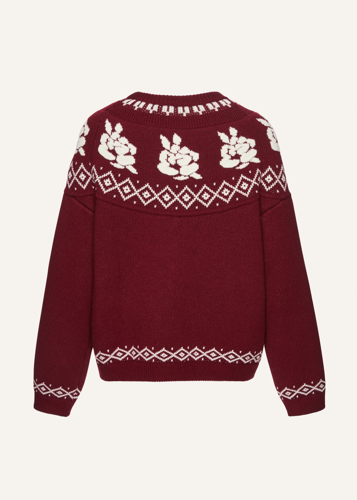 A cozy wool sweater featuring a classic Fair Isle motif reimagined with Magda Butrym's signature touch. The rich burgundy knit is adorned with cream geometric patterns and a row of bold roses encircling the yoke and shoulders, adding a feminine and romantic element to the traditional design. With a relaxed fit and dropped shoulders, this pullover offers timeless winter style with a distinctly modern edge.