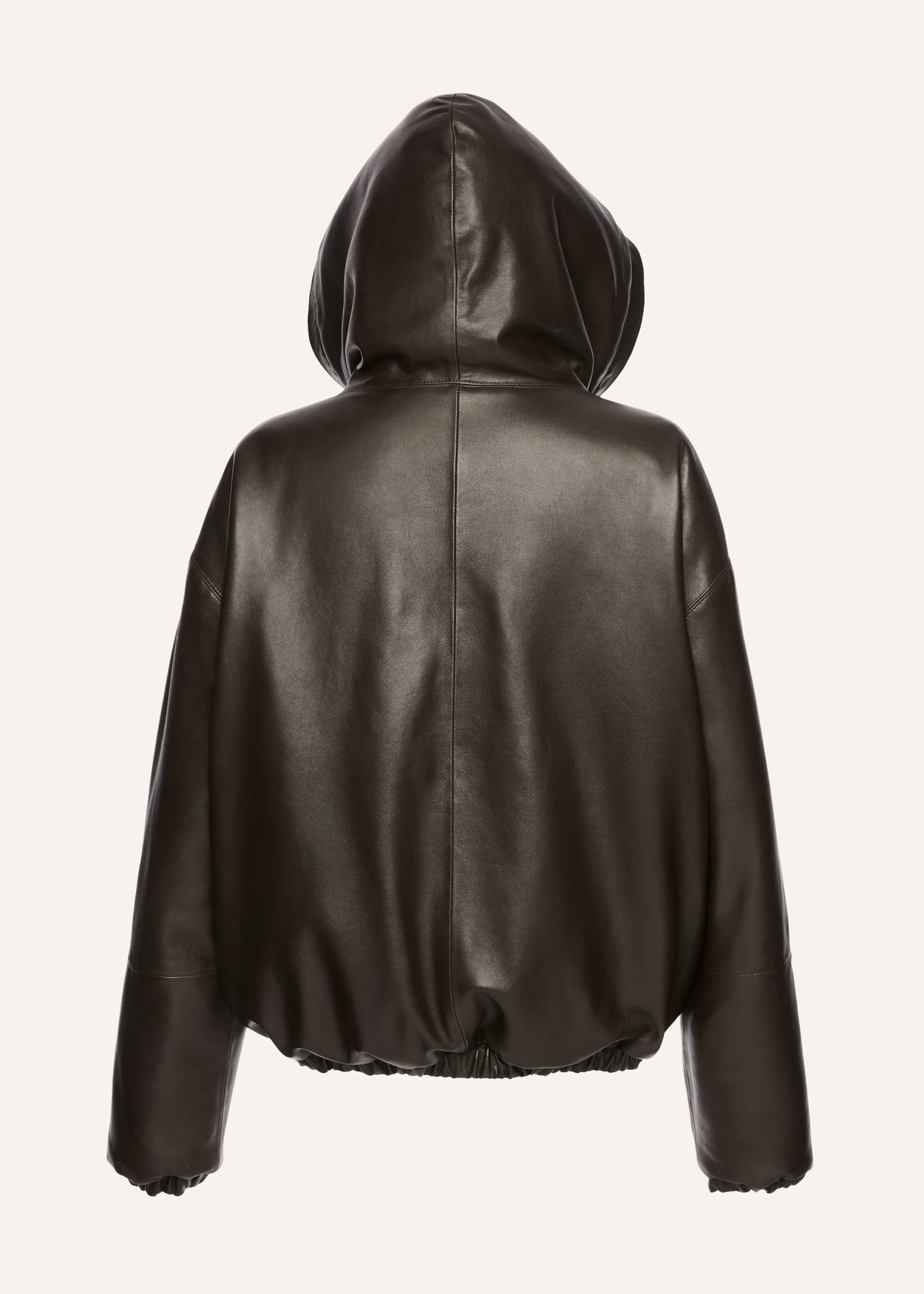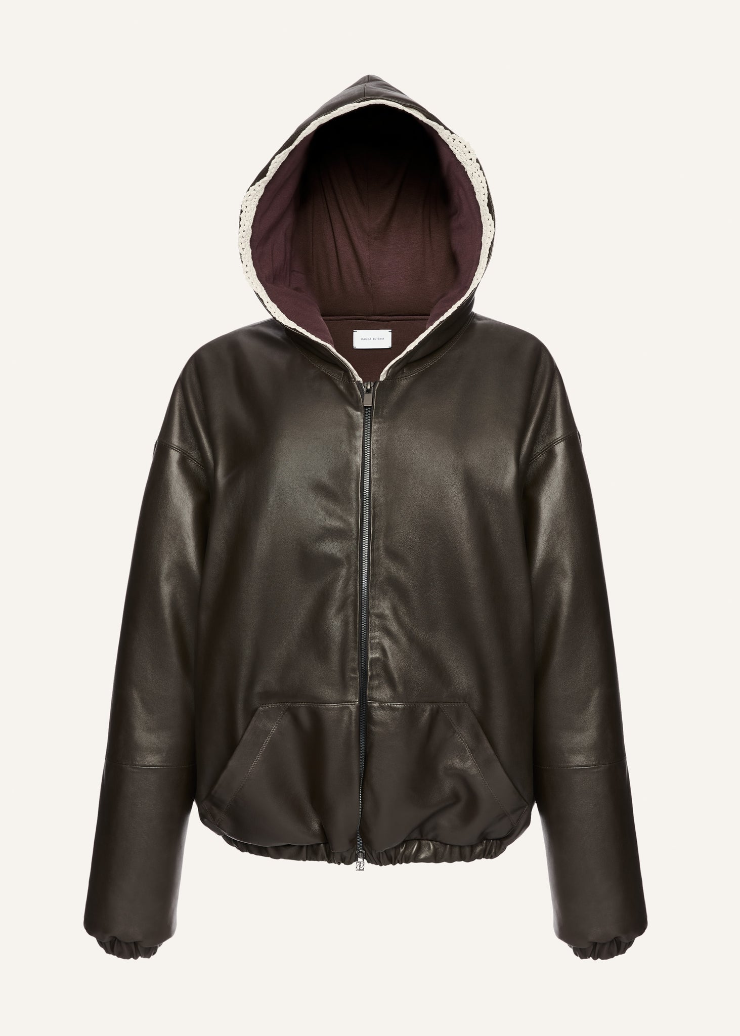 Crafted from smooth, supple leather, it features a soft viscose inner lining. The standout detail is the hood with delicate crochet trim that contrasts its tough exterior with a touch of craftsmanship. Elasticated cuffs and hem provide structure.