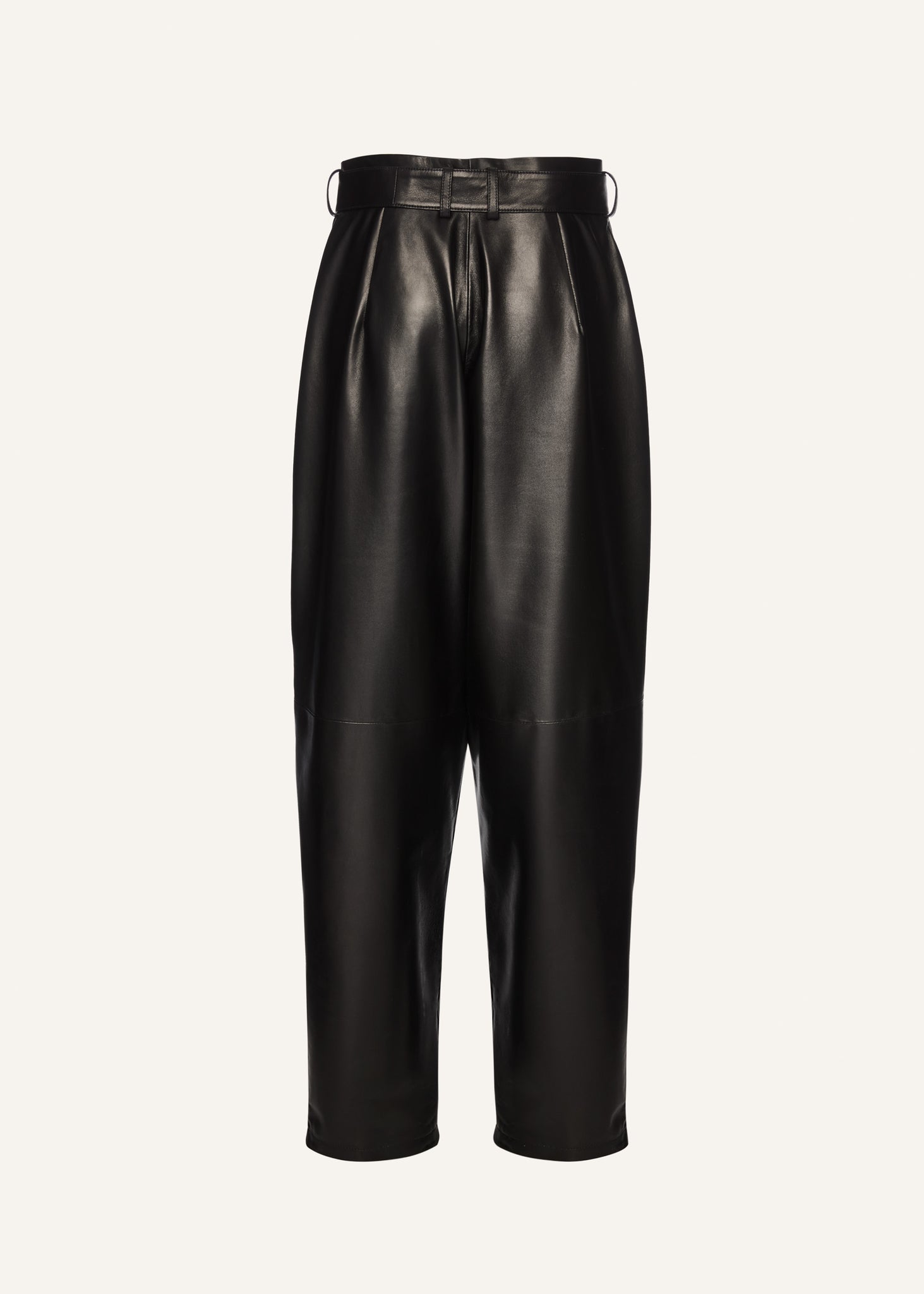 High-waisted trousers crafted from smooth black leather, Tapered through the leg for a structured finish, they feature side pockets and a tonal leather belt to define the waist.
