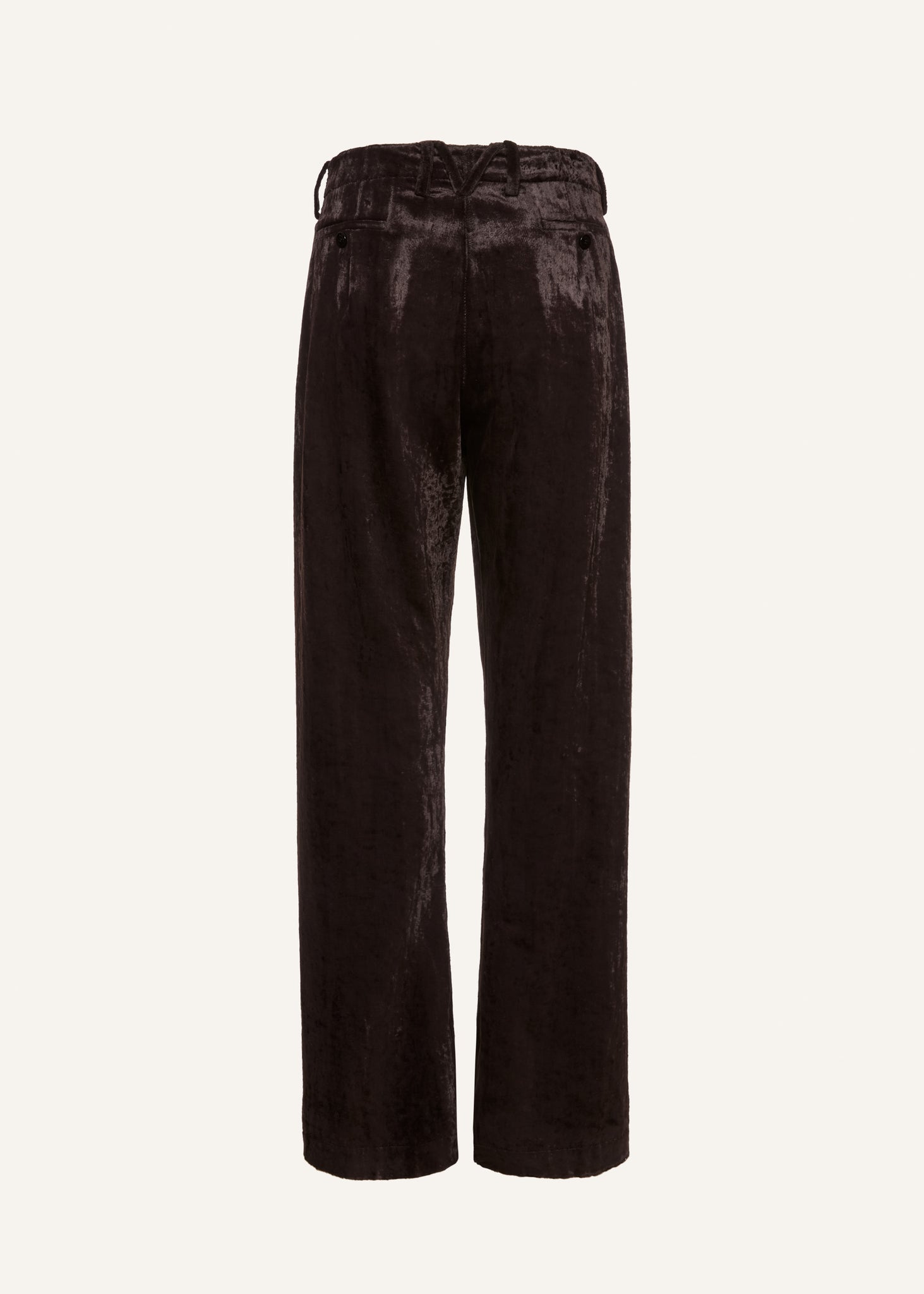 These tailored trousers feature a wide-leg silhouette with side seams shifted toward the front, creating a refined shape. Designed with front welt pockets and single-button back pockets, they have a dropped waistline. The rear belt loops are shaped into an "M" motif for a signature finish.