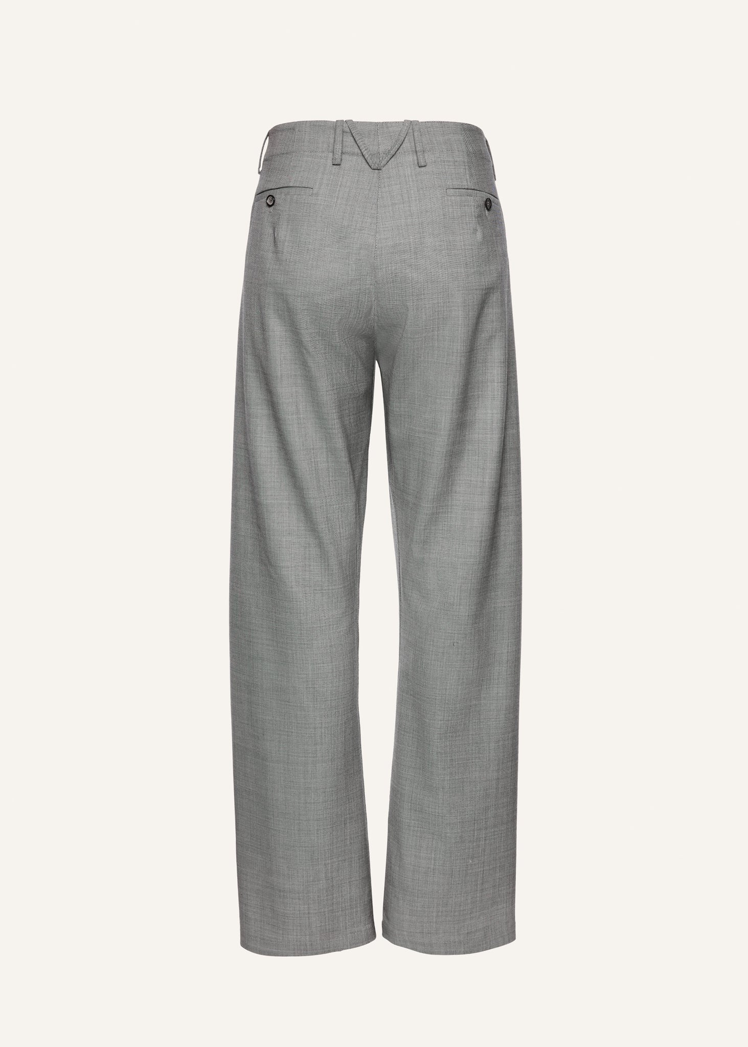 These tailored trousers feature a wide-leg silhouette with side seams shifted toward the front, creating a refined shape. Designed with front welt pockets and single-button back pockets, they have a dropped waistline. The rear belt loops are shaped into an \"M\" motif for a signature finish.