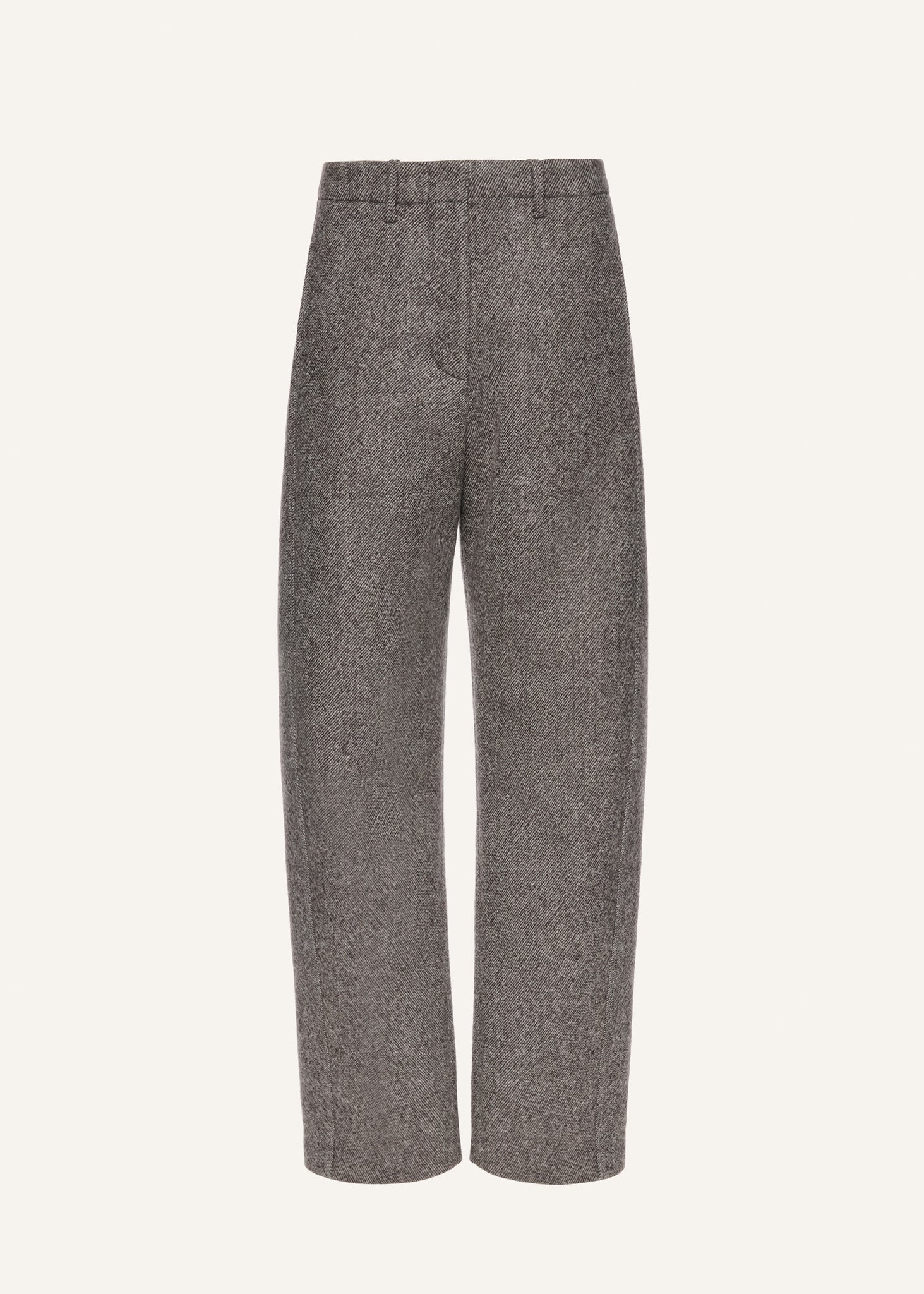 These tailored trousers feature a wide-leg silhouette with side seams shifted toward the front, creating a refined shape. Designed with front welt pockets and single-button back pockets, they have a dropped waistline. The rear belt loops are shaped into an "M" motif for a signature finish.
