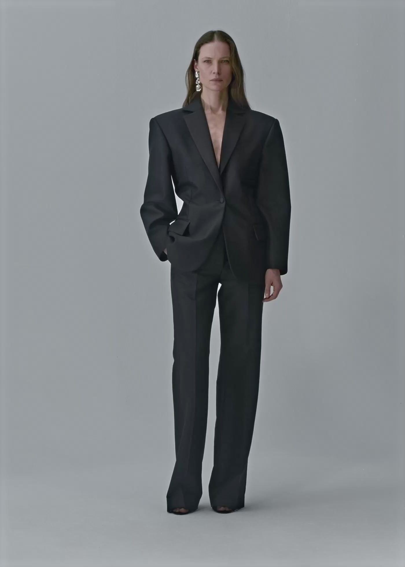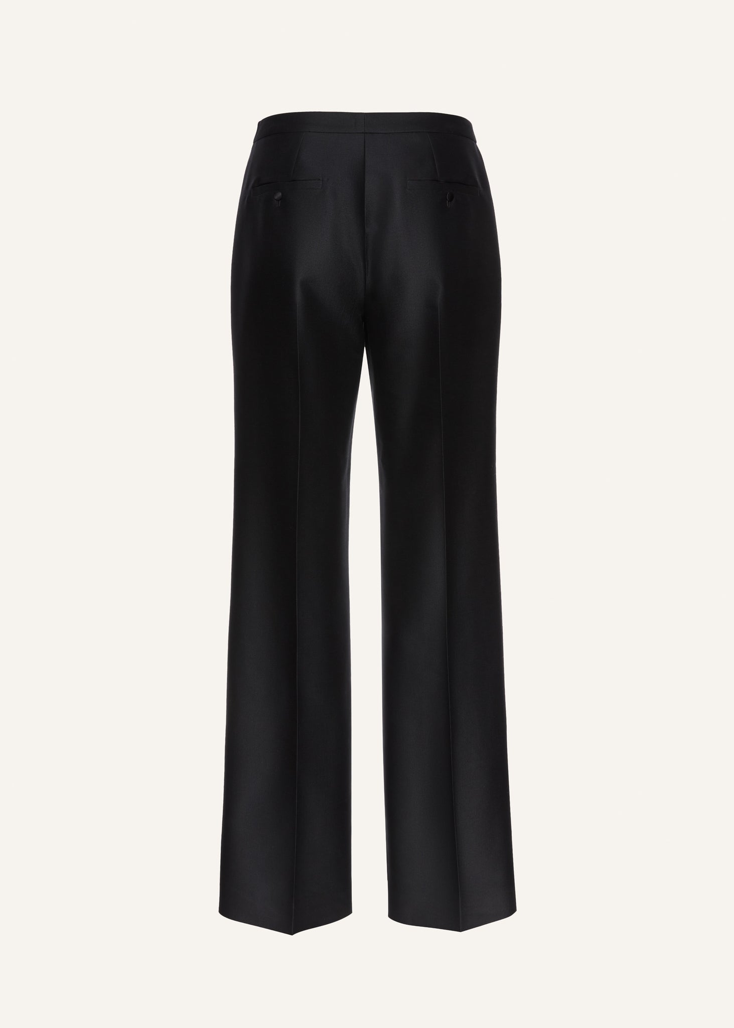 Tailored from wool and silk blend, these straight-leg trousers feature crisp front and back creases, enhanced by tonal side tuxedo stripes. The clean silhouette is complemented by discreet side seam pockets and back welt pockets with button closures.