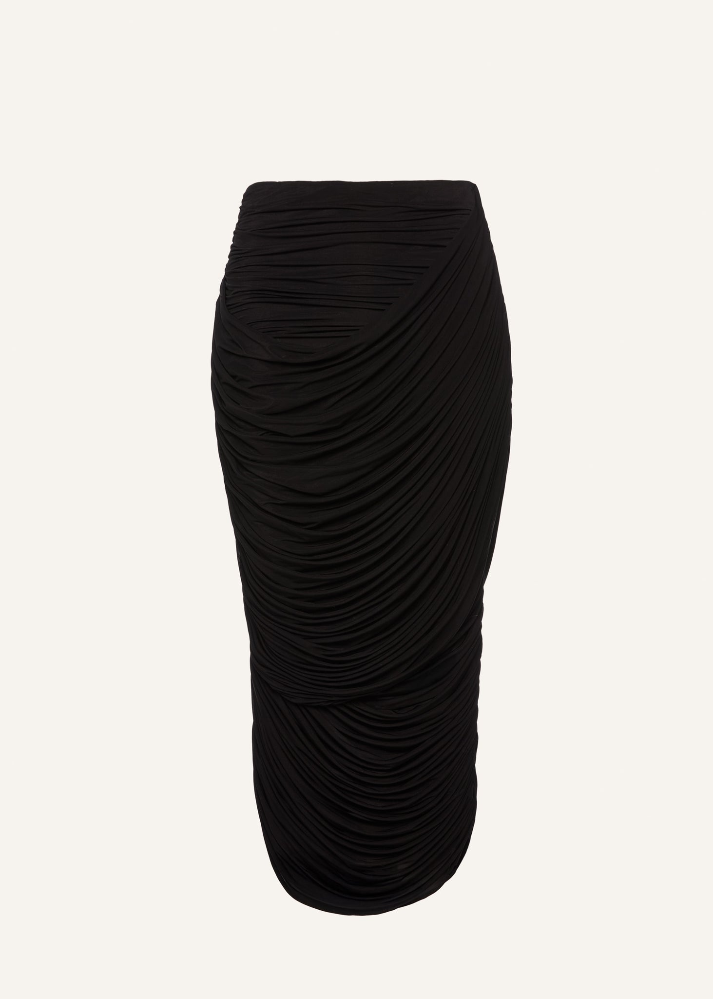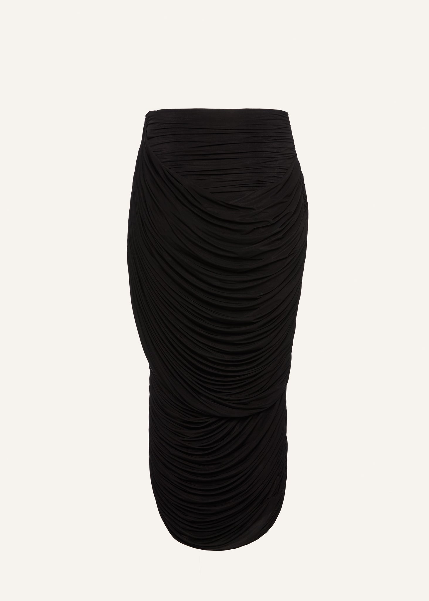A below-the-knee skirt crafted from cupro with rich ruching along the sides. Draped overlays at the hips and hem create a layered silhouette. Finished with an elastic waistband and lined with a smooth mini skirt underneath for added coverage.