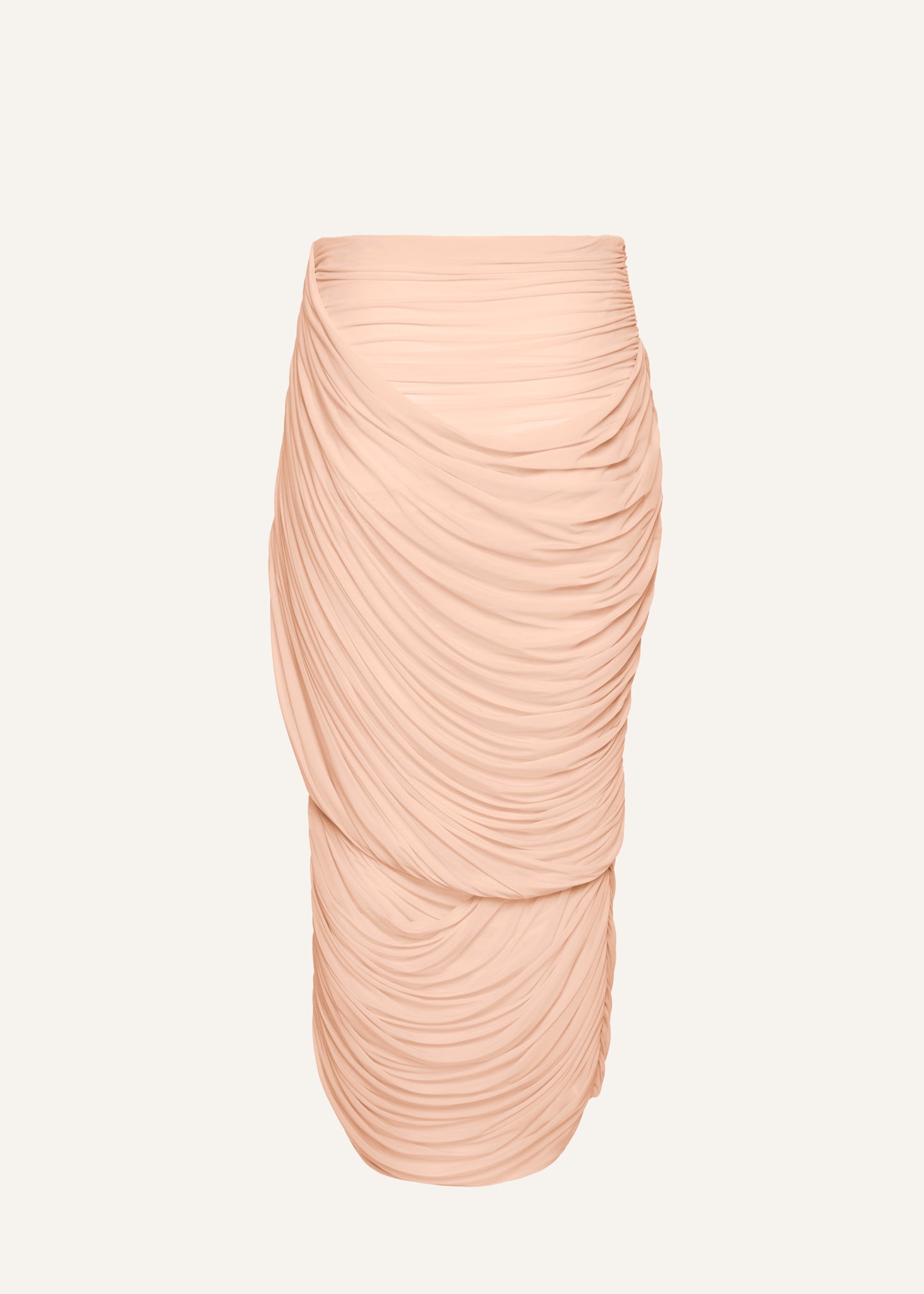 A below-the-knee skirt crafted from cupro with rich ruching along the sides. Draped overlays at the hips and hem create a layered silhouette. Finished with an elastic waistband and lined with a smooth mini skirt underneath for added coverage.
