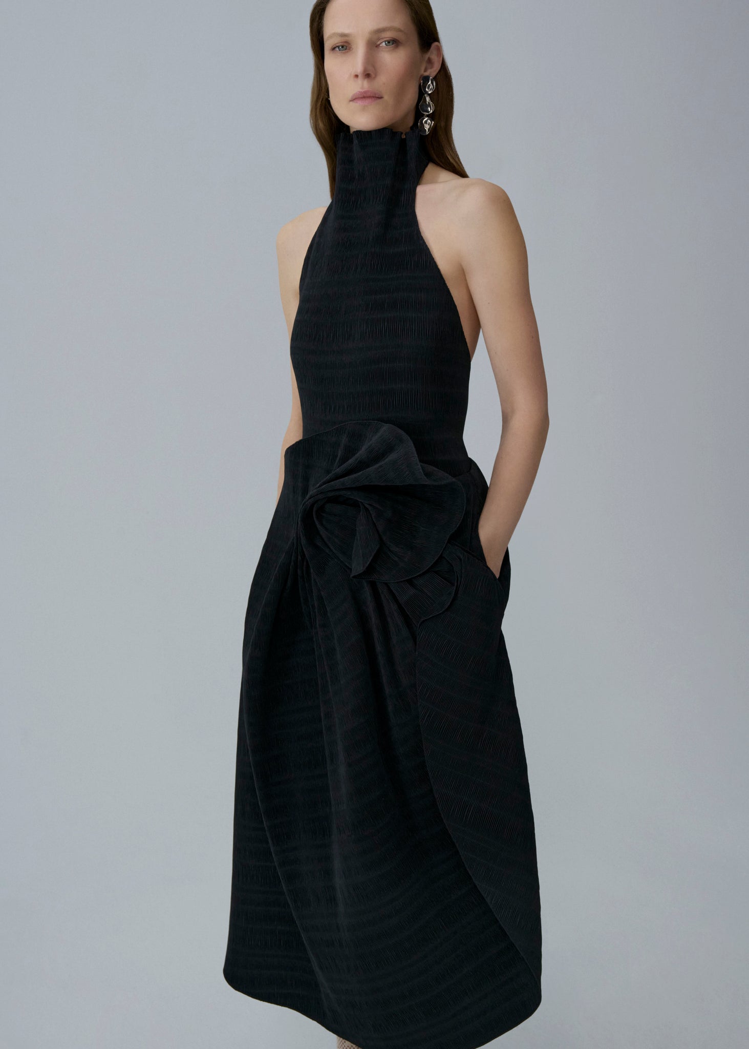 A slightly flared long skirt in structured fabric, featuring a standout sculptural overlay twisted into a flower motif at the front. Designed with discreet side seam pockets and secured with a concealed back zipper.