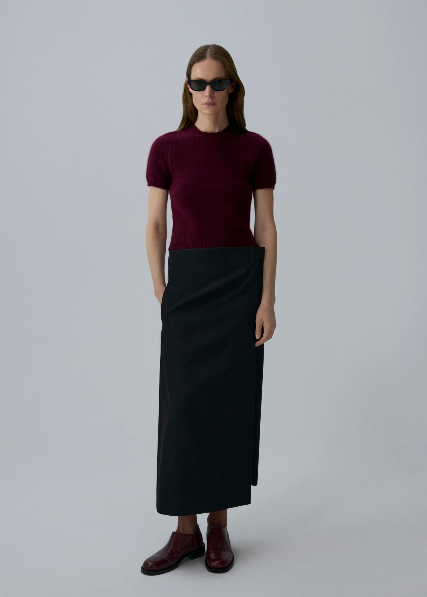 Wrap-style long skirt secured with two buttons and an adjustable waistband on the left side with an additional button closure. Includes a side seam pocket on the right and is fully lined in silk.