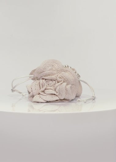 The Magda bag is Magda Butrym's iconic handbag: a bucket bag adorned with large 3D roses on either side of the body. The crochet version adds a signature element of Magda DNA through its handmade flowers and features a satin body. This limited edition has an additional pearl handle so the wearer can choose between a pearl handle or a detachable classic leather crossbody strap.