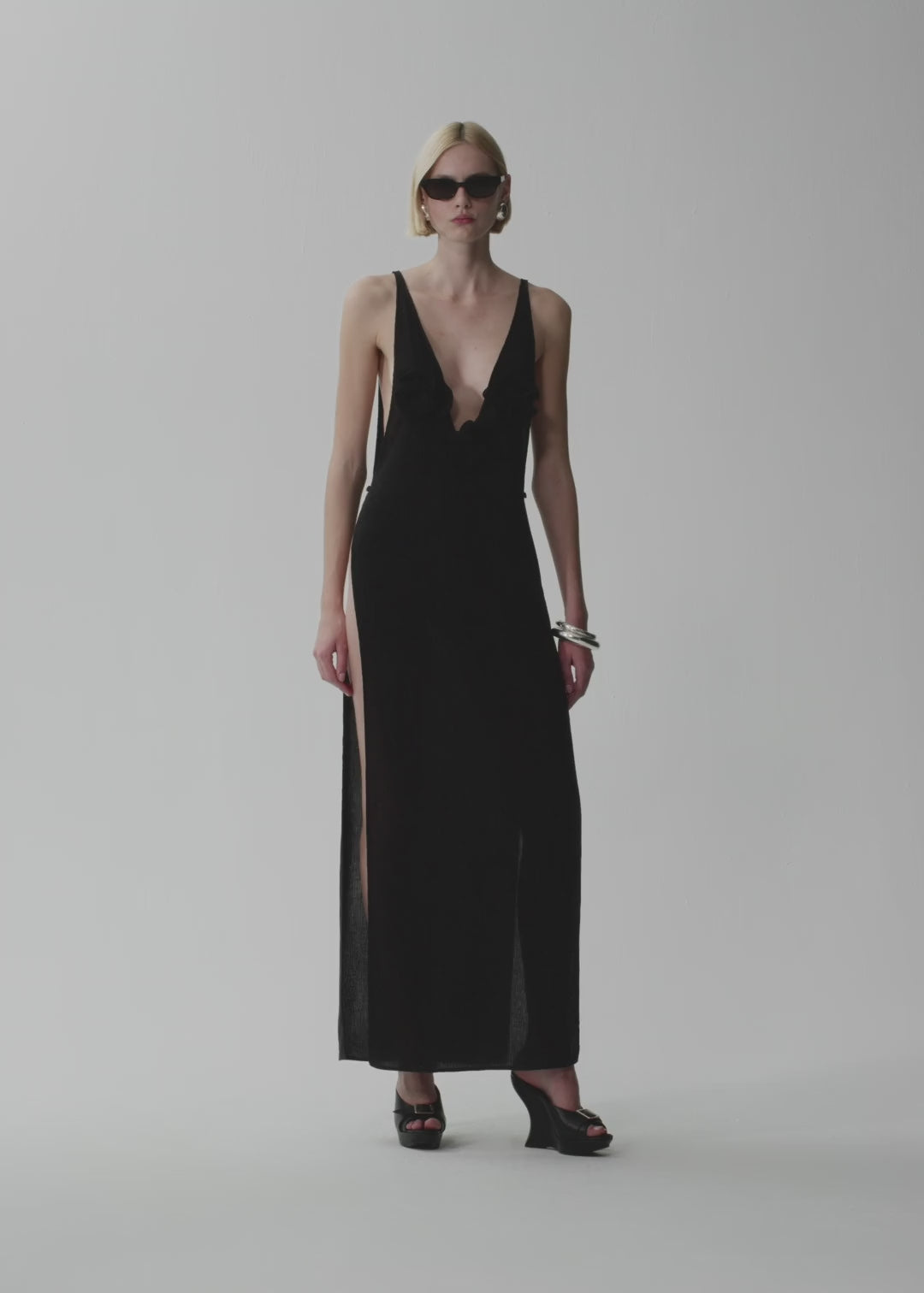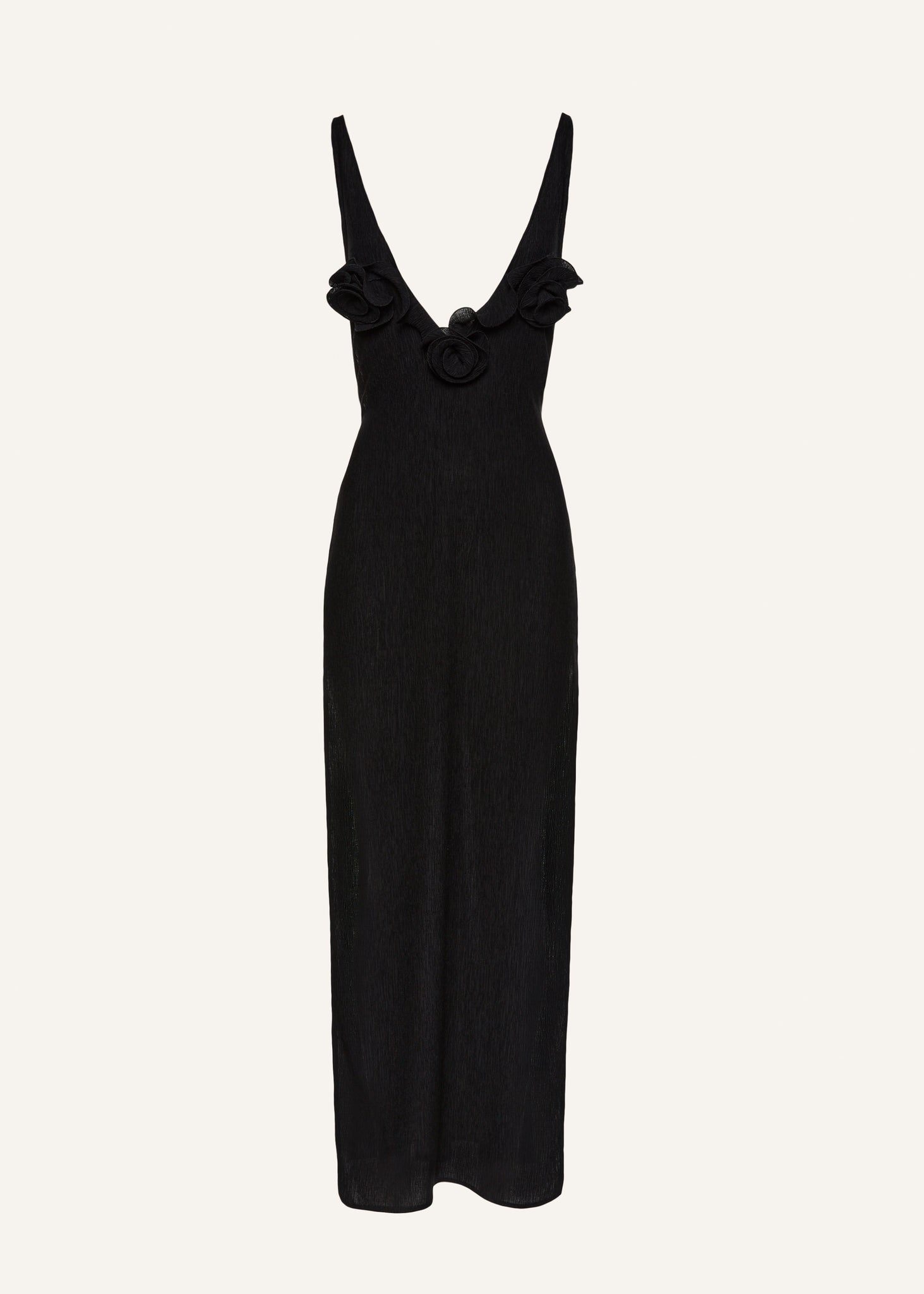 A textured crepe maxi dress featuring a deep v neckline embellished with 3D rose appliqués and high side leg slits that button at the waist.