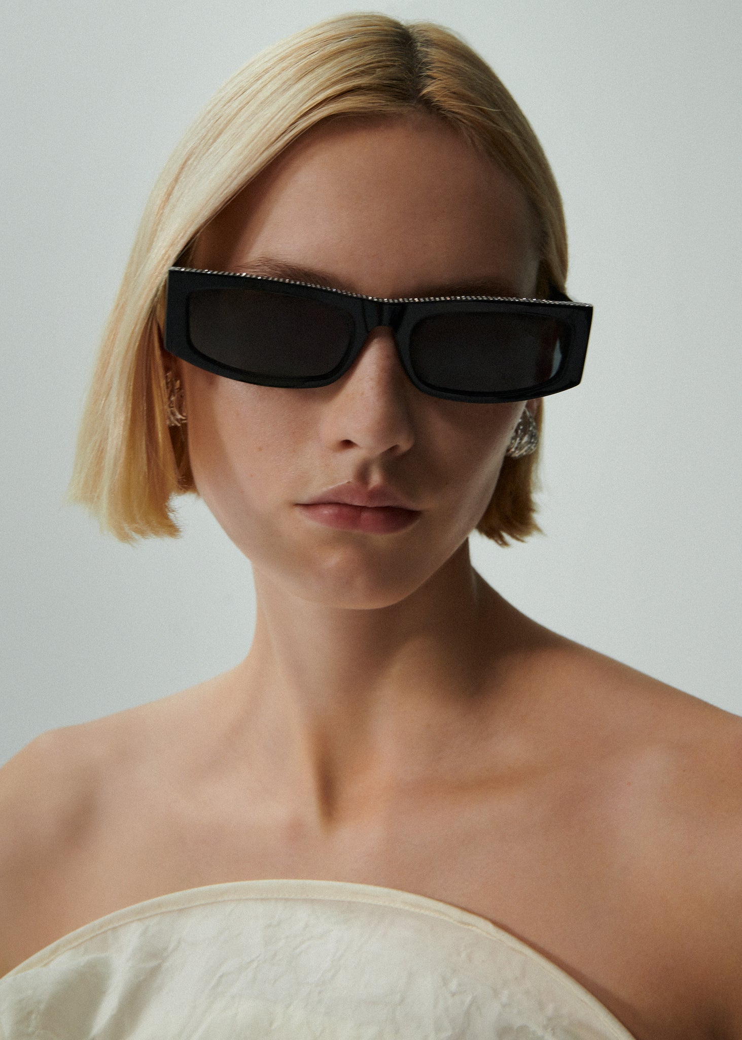 Acetate sunglasses with rectangular lens. Black frames are complimented by Magda's signature crystal embellishment and logo on the temple.