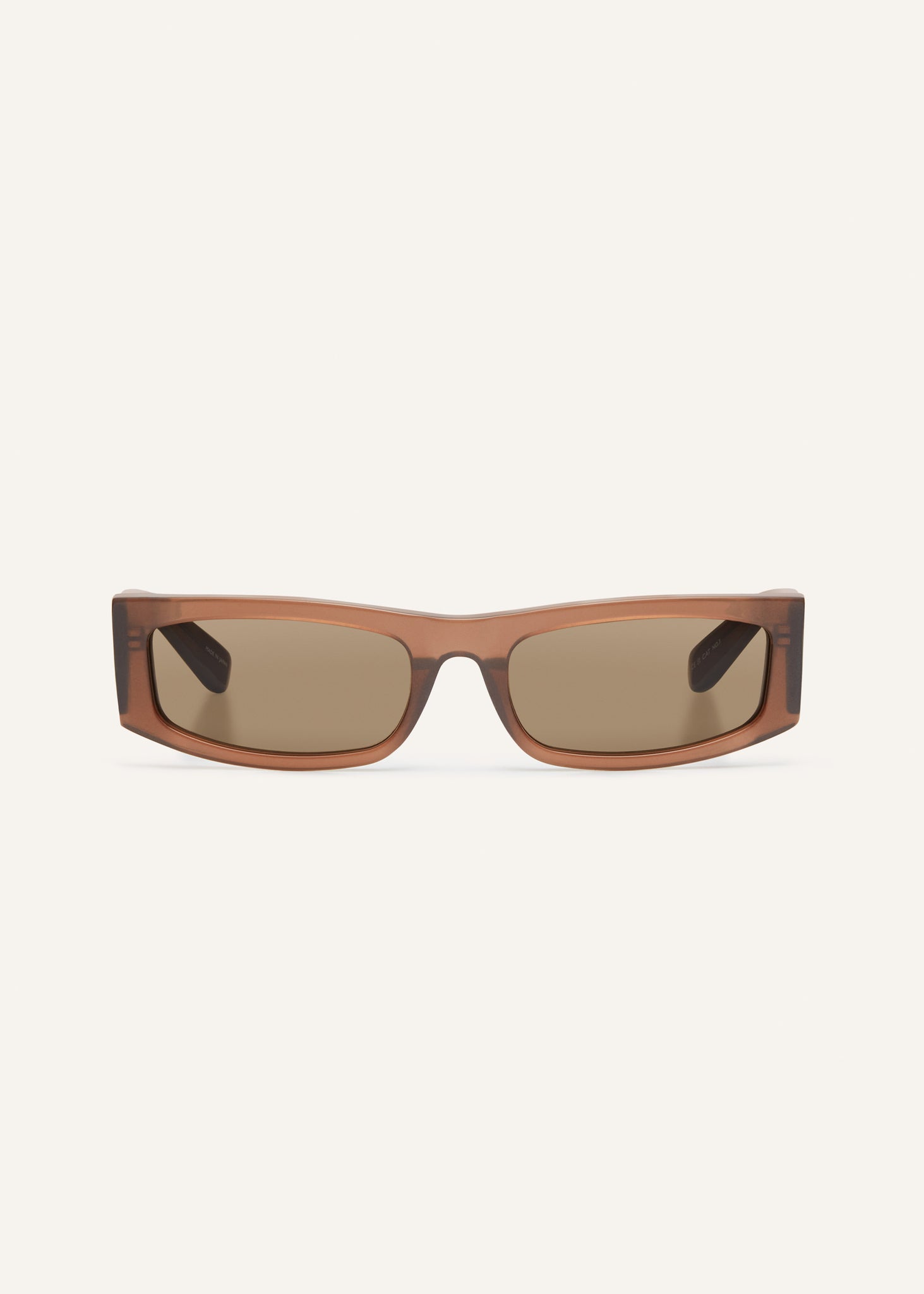Acetate sunglasses in taupe brown with rectangular lens. Complimented by Magda's logo on the temple.