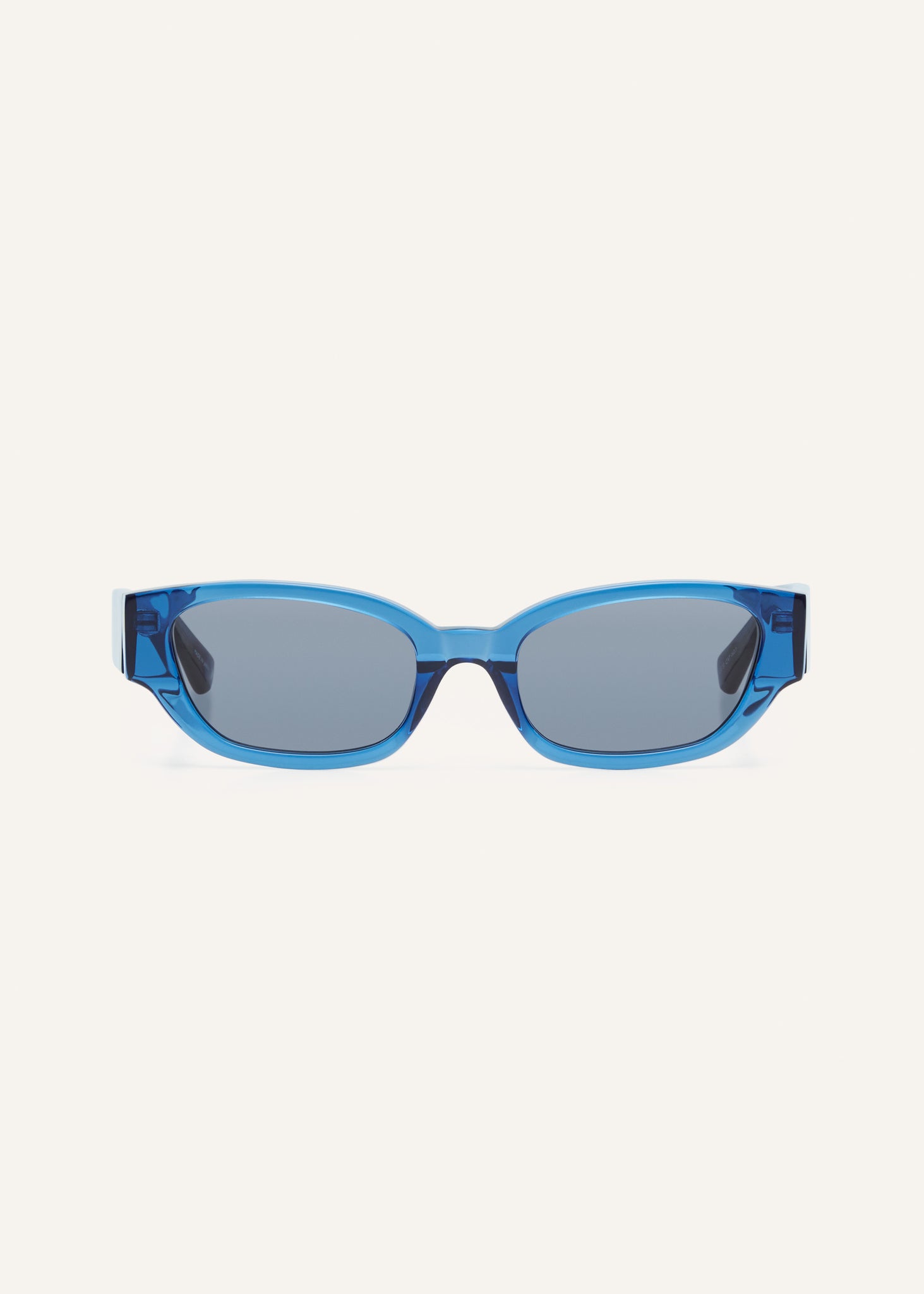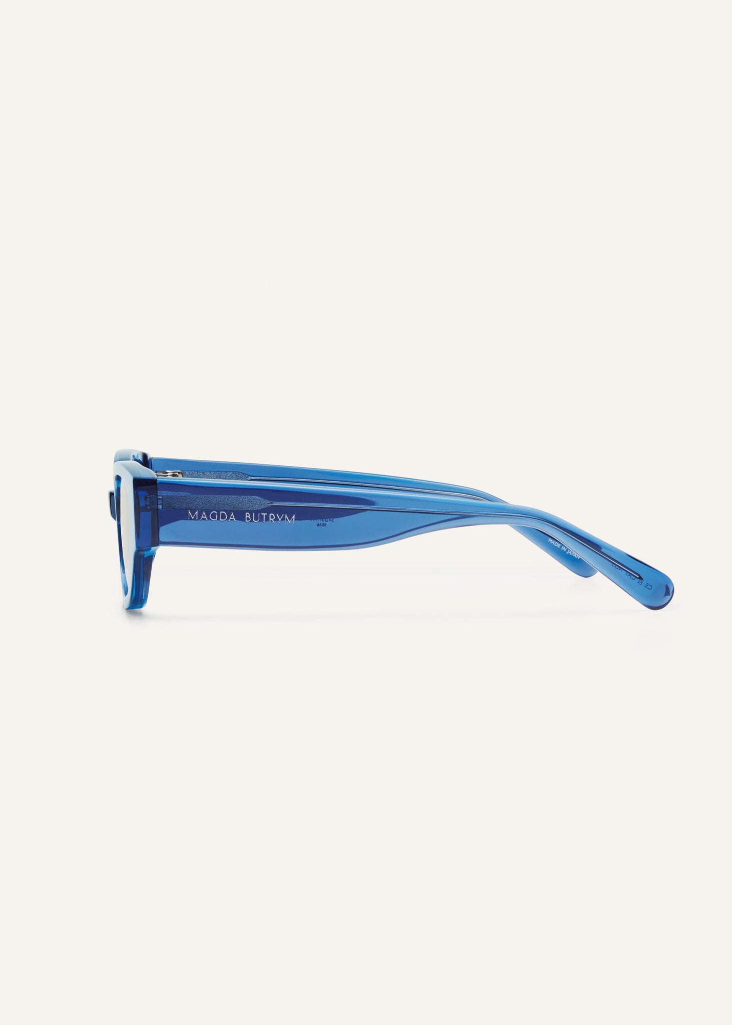 Modern cat-eye silhouette in cobalt blue with logo on the temple.