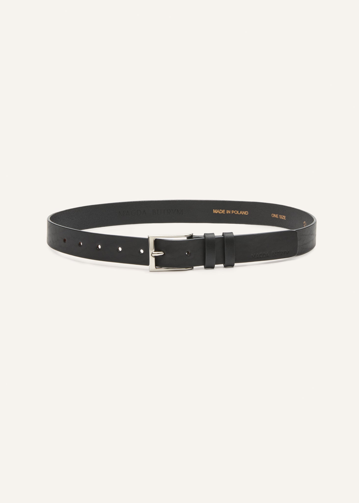 A sleek and versatile black leather belt, distinguished by its silver-tone buckle and embossed brand logo detail. Crafted from premium leather with a grained finish.