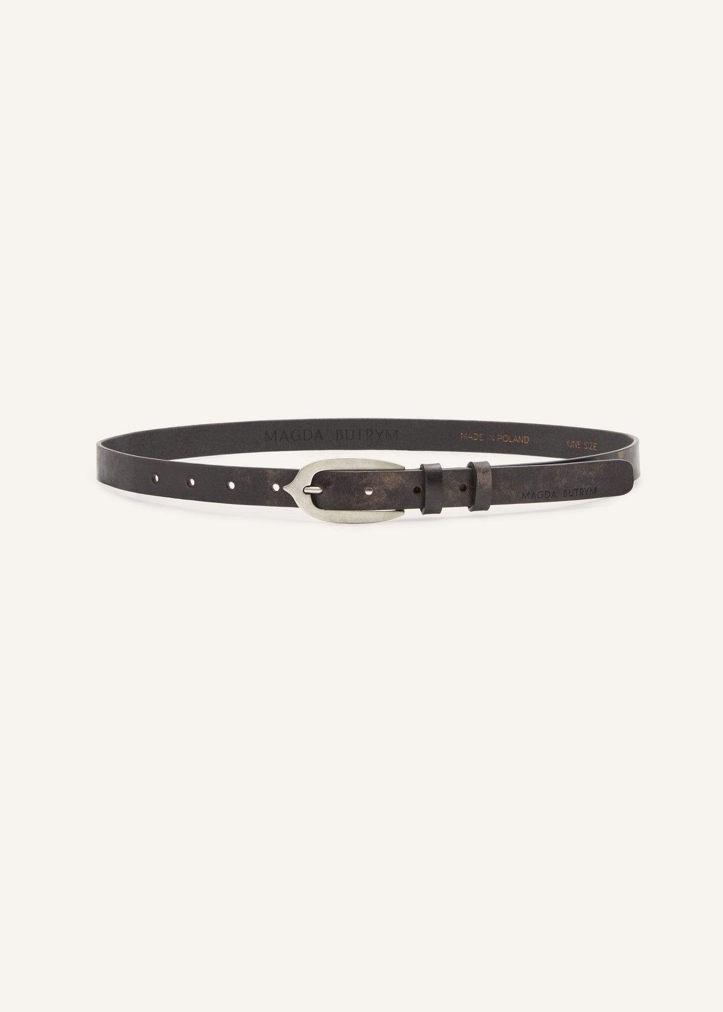 Crafted from premium leather with a distressed, vintage finish, this belt exudes timeless character. The standout feature is its archer-shaped silver-tone buckle, adding a distinctive touch to its minimalist design. Subtle embossing and reinforced loops enhance its artisanal quality, making it a versatile piece for both casual and elevated ensembles.