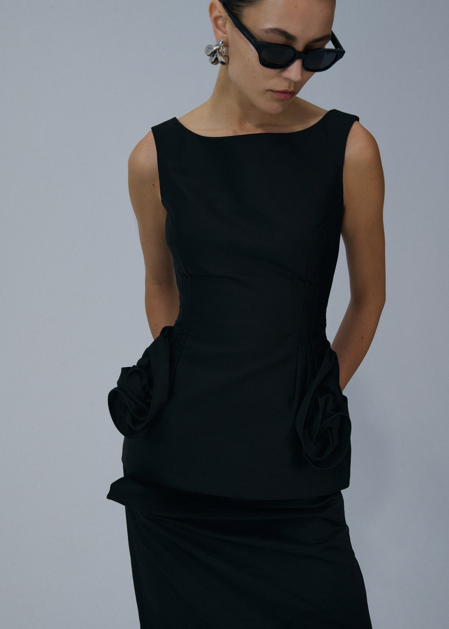A structured cotton sheath top with a longline length and hourglass shape, hugging the waist and flaring out at the hips. Rose appliqué bunches adorn the hips for a signature Magda Butrym touch, finished with a sleeveless cut and round neck.