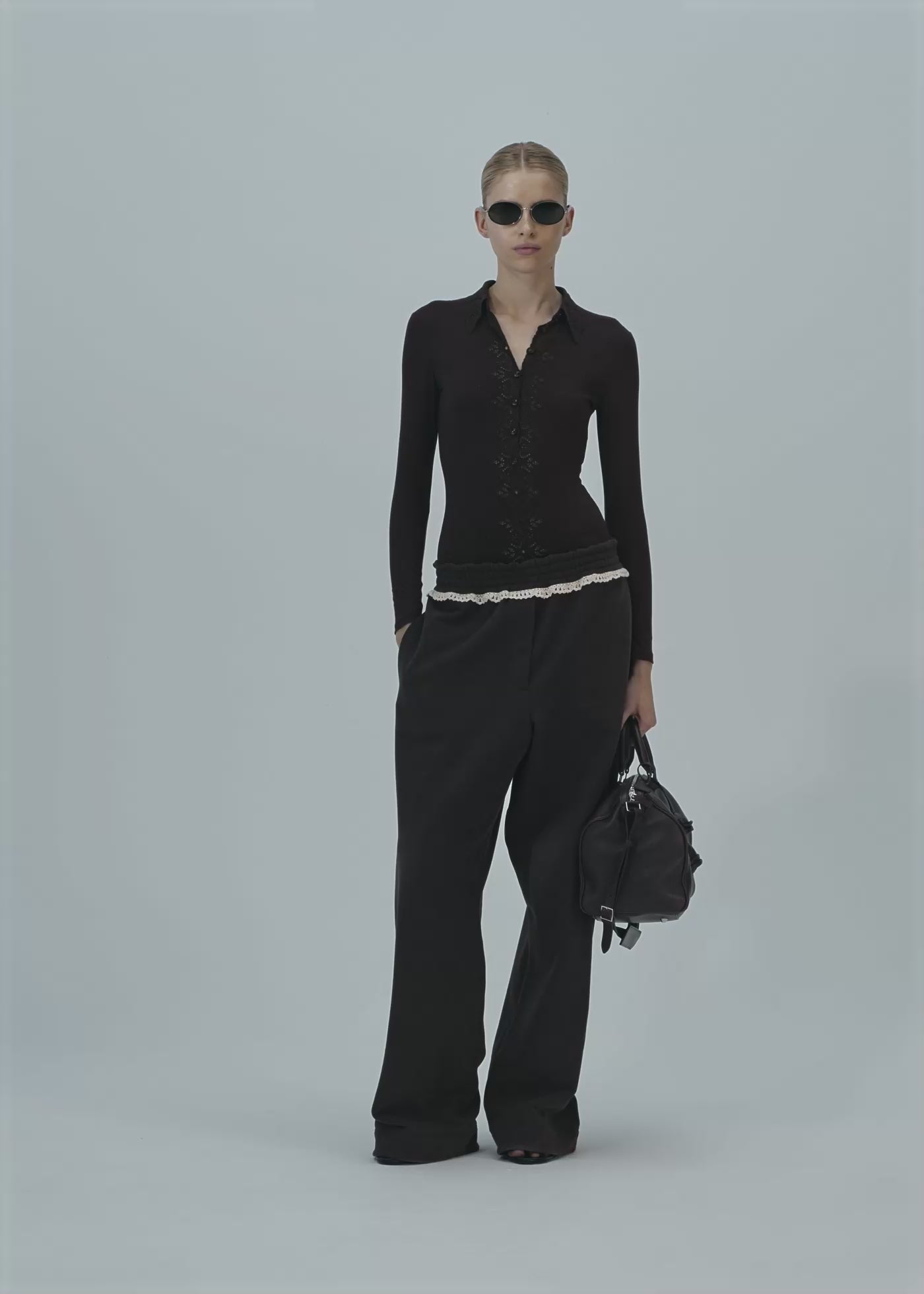 A long sleeve bodysuit with a buttoned polo collar and embroidered floral tricot detailing at front.