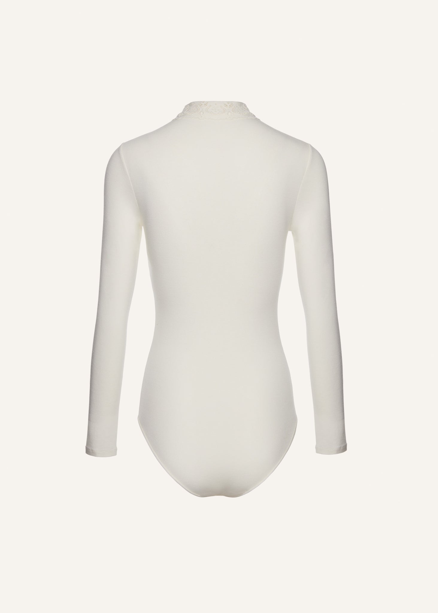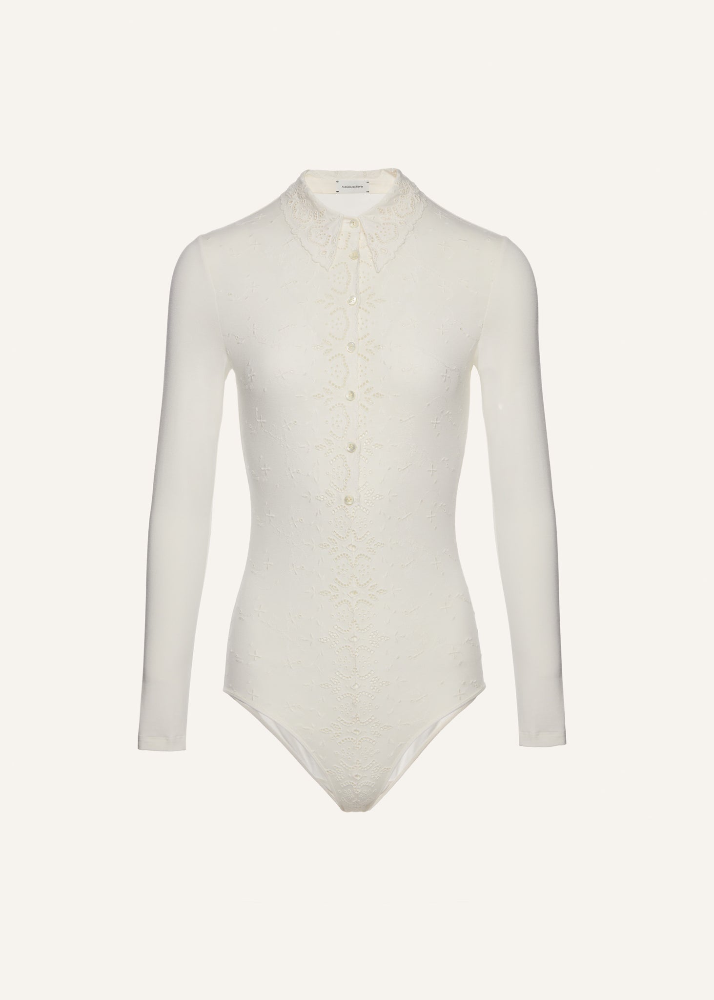 A long sleeve bodysuit with a buttoned polo collar and embroidered floral tricot detailing at front.