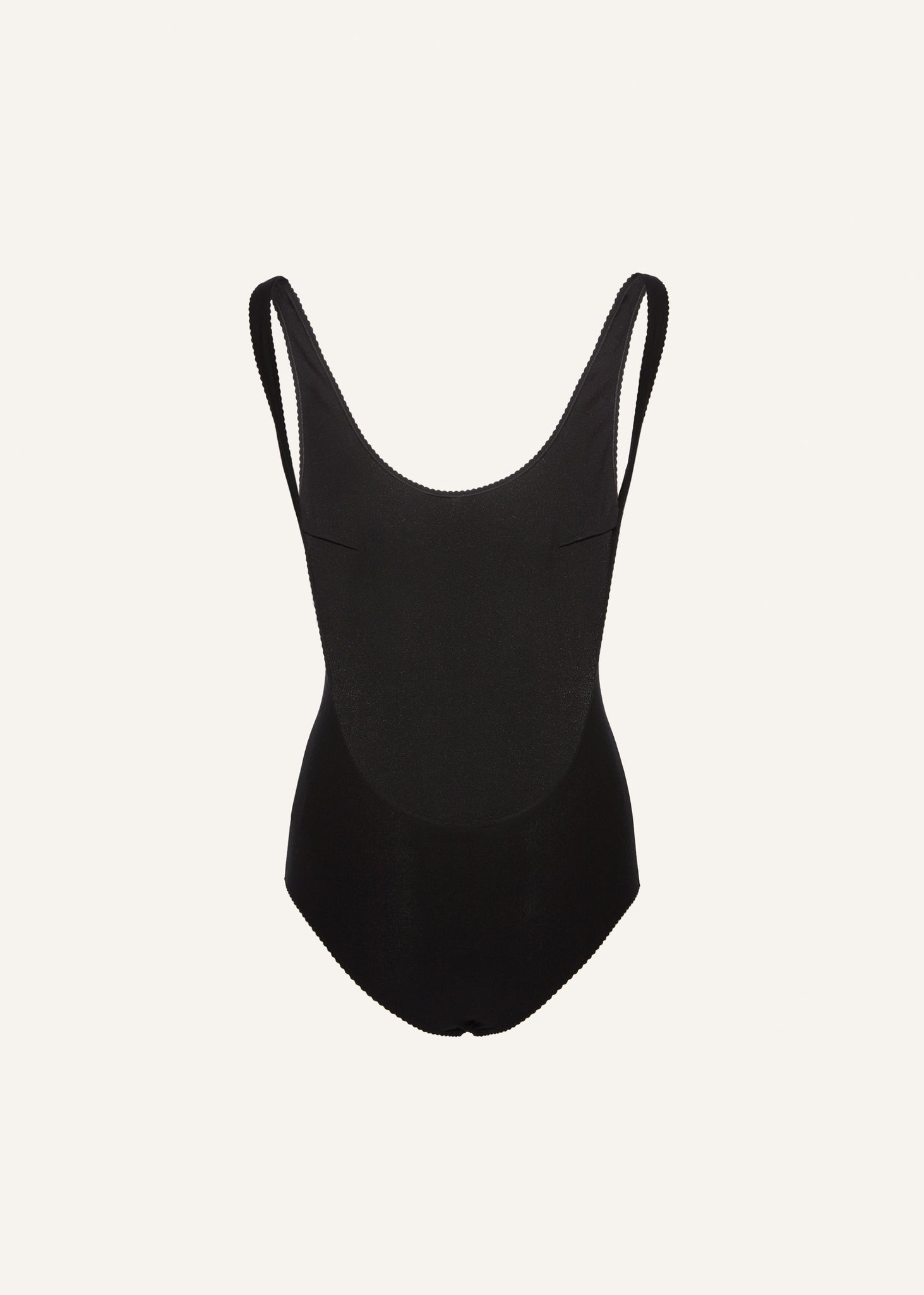 A simple jersey bodysuit with tank straps, a round neck and an open scoop-back, finished with a subtle scalloped trim.