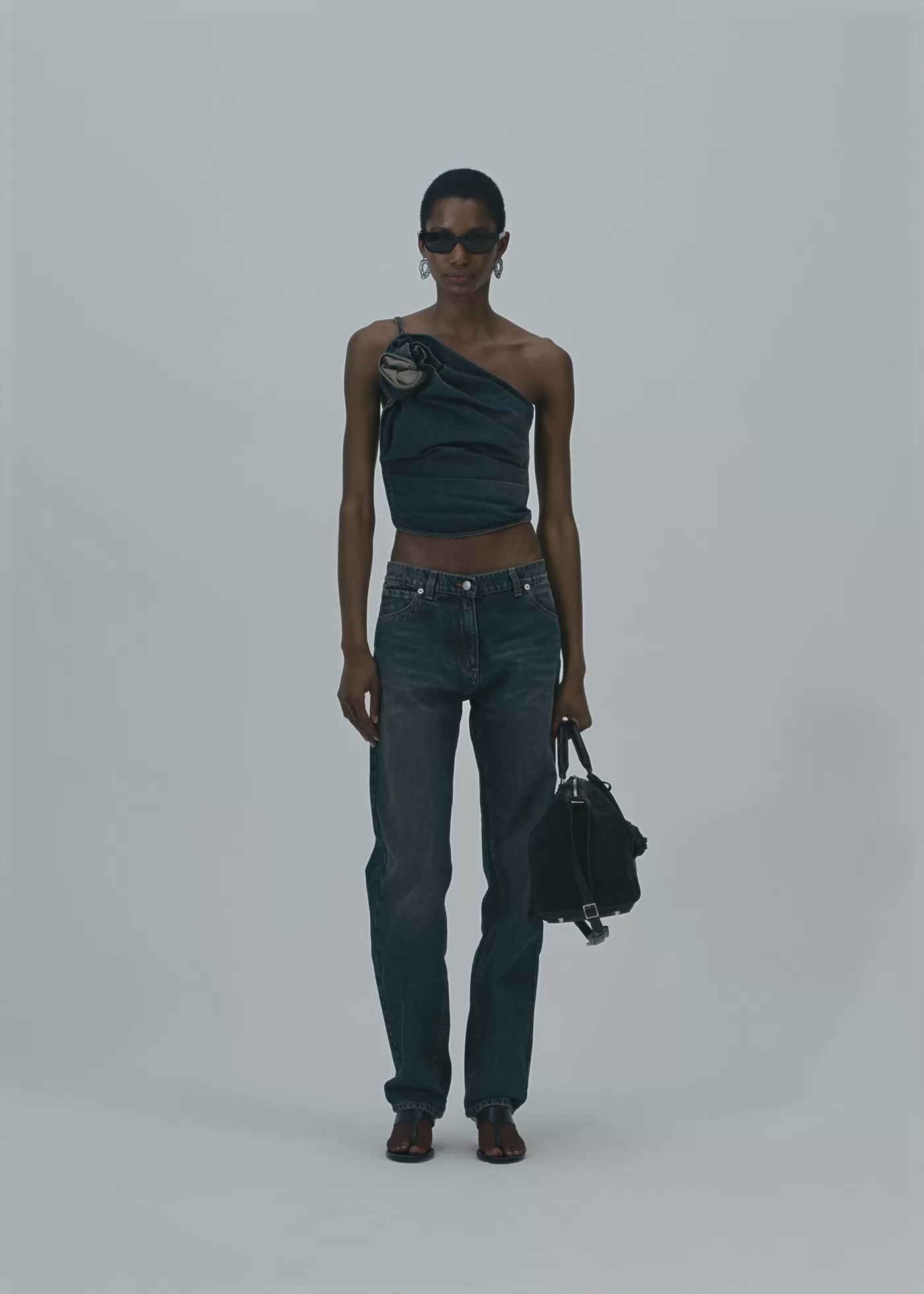 A one-shoulder top that is delicately draped to create a strong, structured shape, with a flower appliqué at the strap.