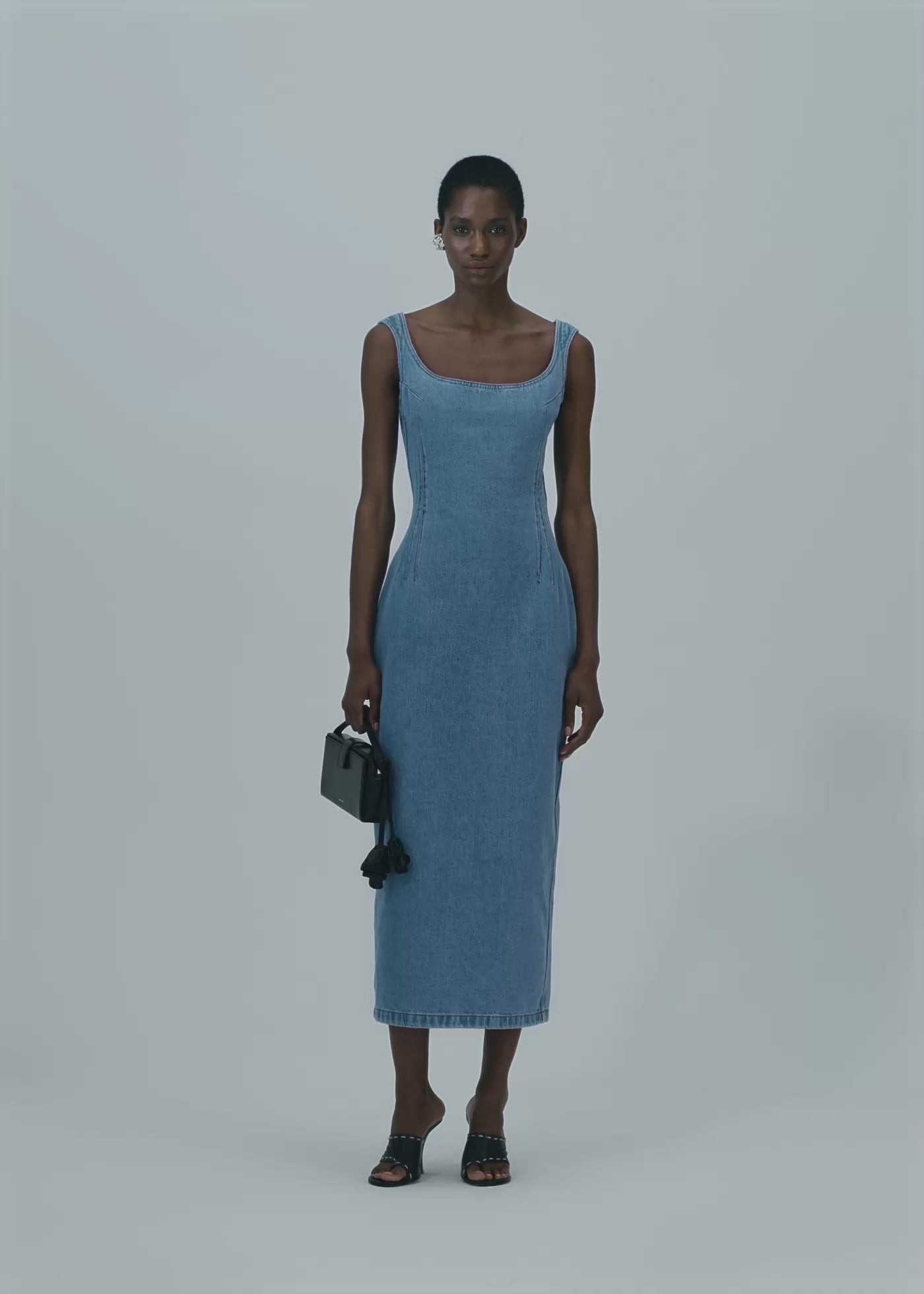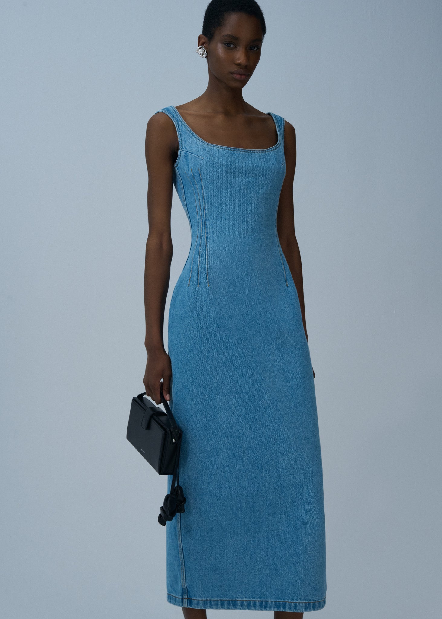 This midi dress is cut with a subtle sculpted shape to create a natural hourglass effect, with a fitted, sleeveless round-neck bodice and a long skirt that hits below the knees and widens at the hips.
