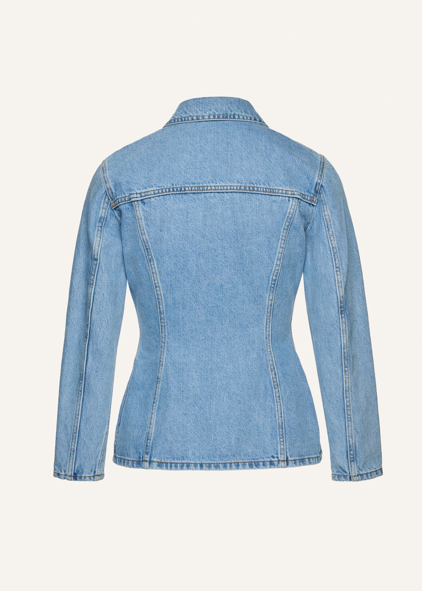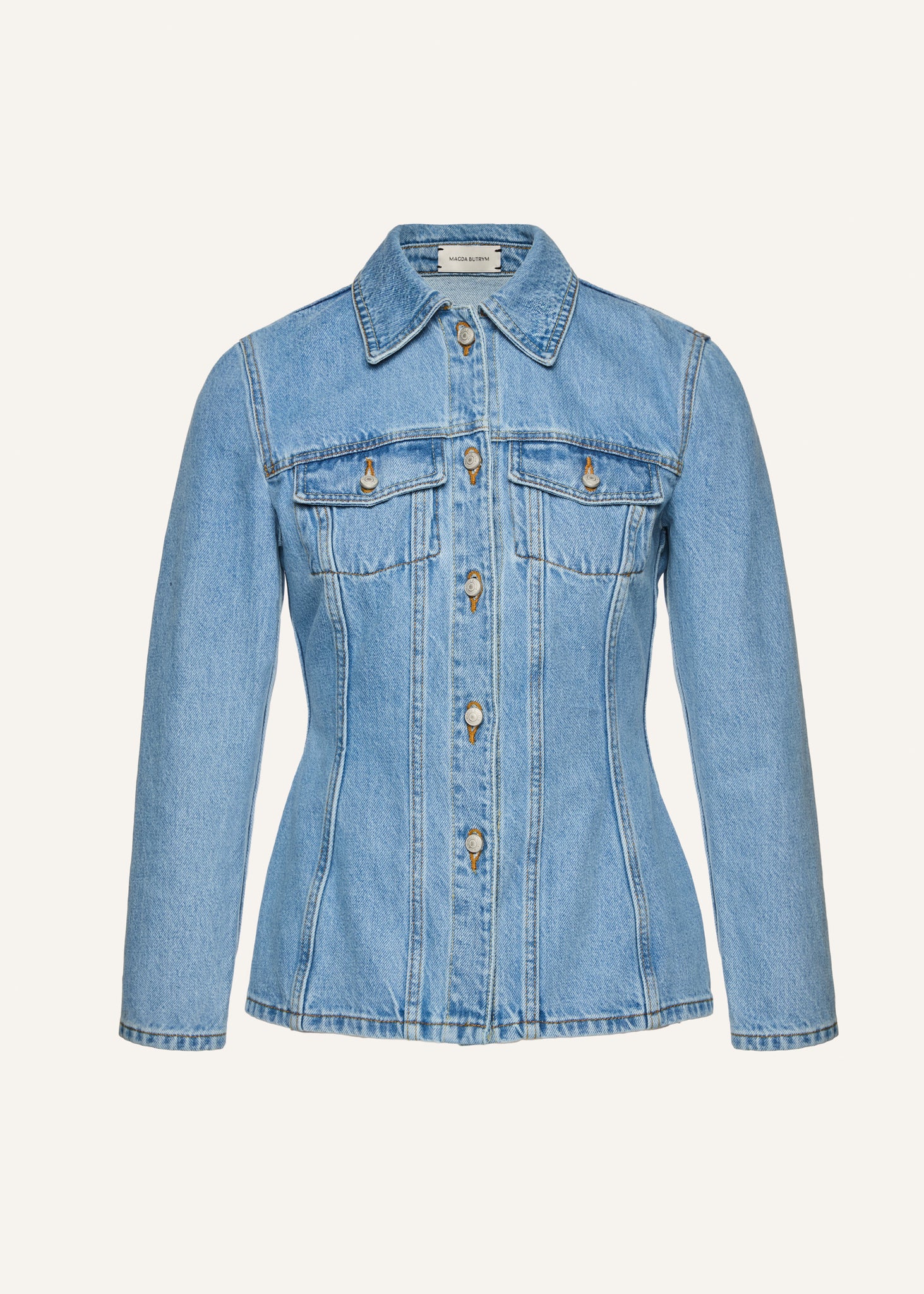 This denim blouse is designed with a contoured, fitted silhouette that accentuates the waist. Featuring a pointed collar, flap chest pockets with metal button detailing, and full-length sleeves, it offers a sleek and flattering shape. The structured seams and paneled construction elevate this everyday staple, making it an effortlessly chic layering piece. Perfect for pairing with matching denim or a casual dress for a polished yet relaxed look.