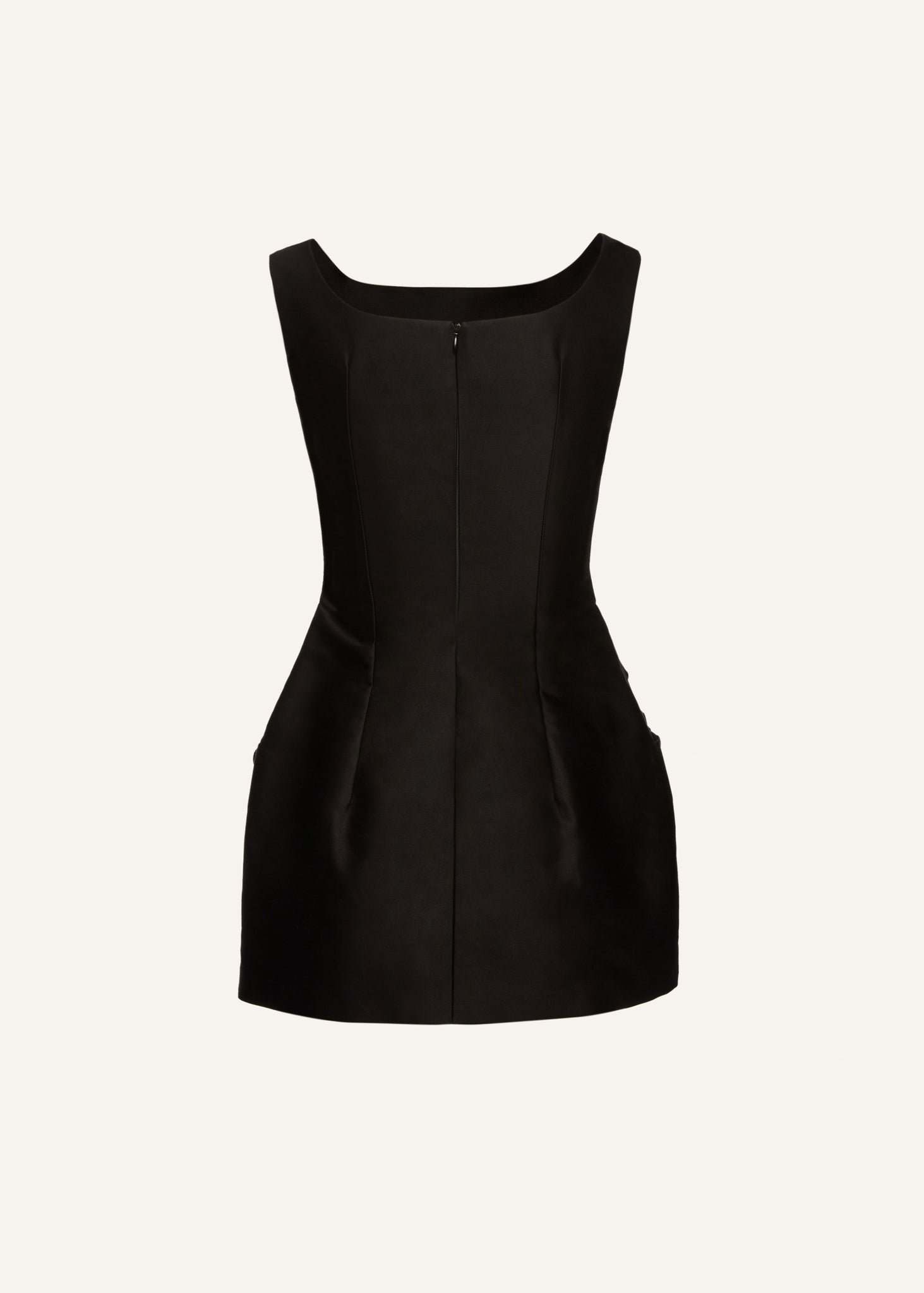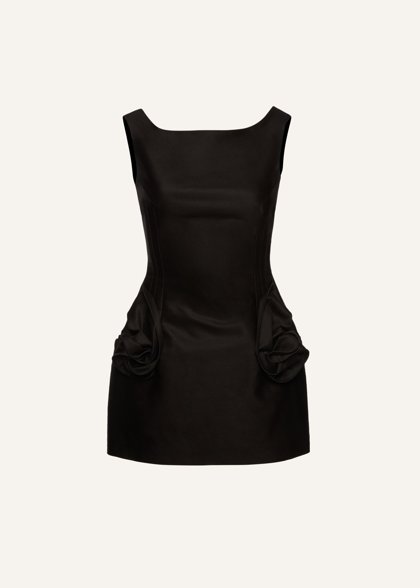 A fitted sheath mini dress with a structured shape offering a subtly flared skirt with rose appliqué detailing at the hips and a high-neckline.