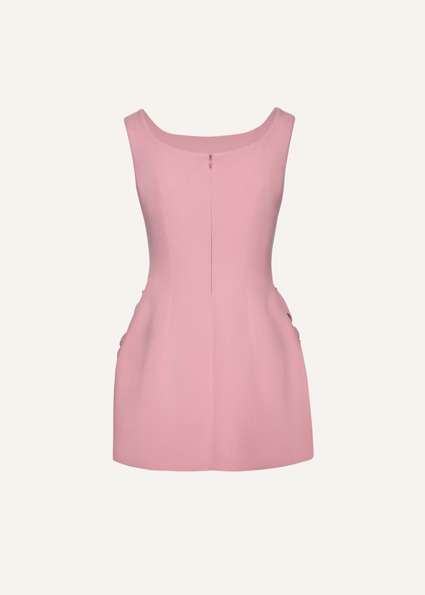 A fitted sheath mini dress with a structured shape offering a subtly flared skirt with rose appliqué detailing at the hips and a high-neckline.