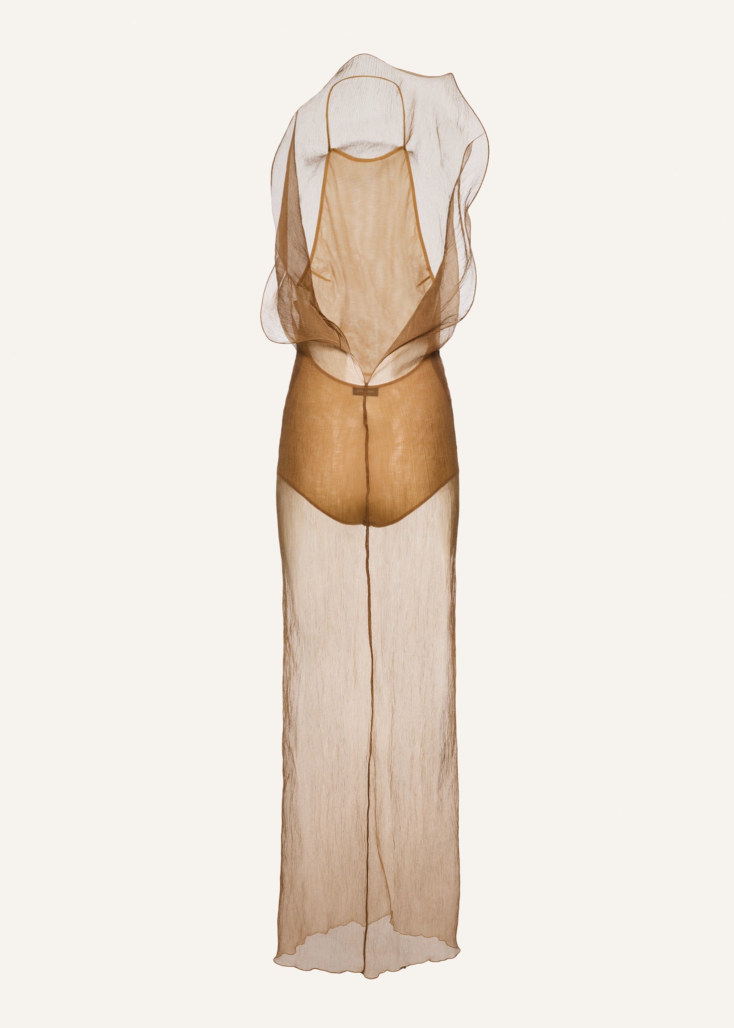 This floor-length gown exudes elegance and modern sophistication with its delicate silk organza fabric. The semi-sheer beige material is expertly draped, creating a fluid, ethereal silhouette. Soft, wavy ruffles cascade down the sides, adding a touch of sculptural artistry. The sculptural neckline and open-back design elevate its sensual allure, while the layered sheer skirt lends an air of lightness and grace.