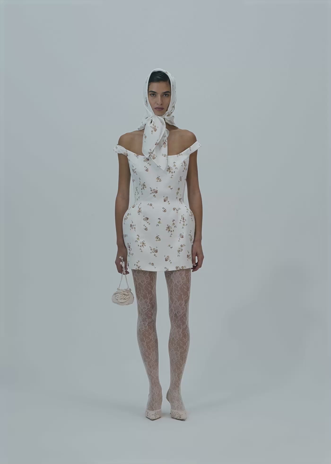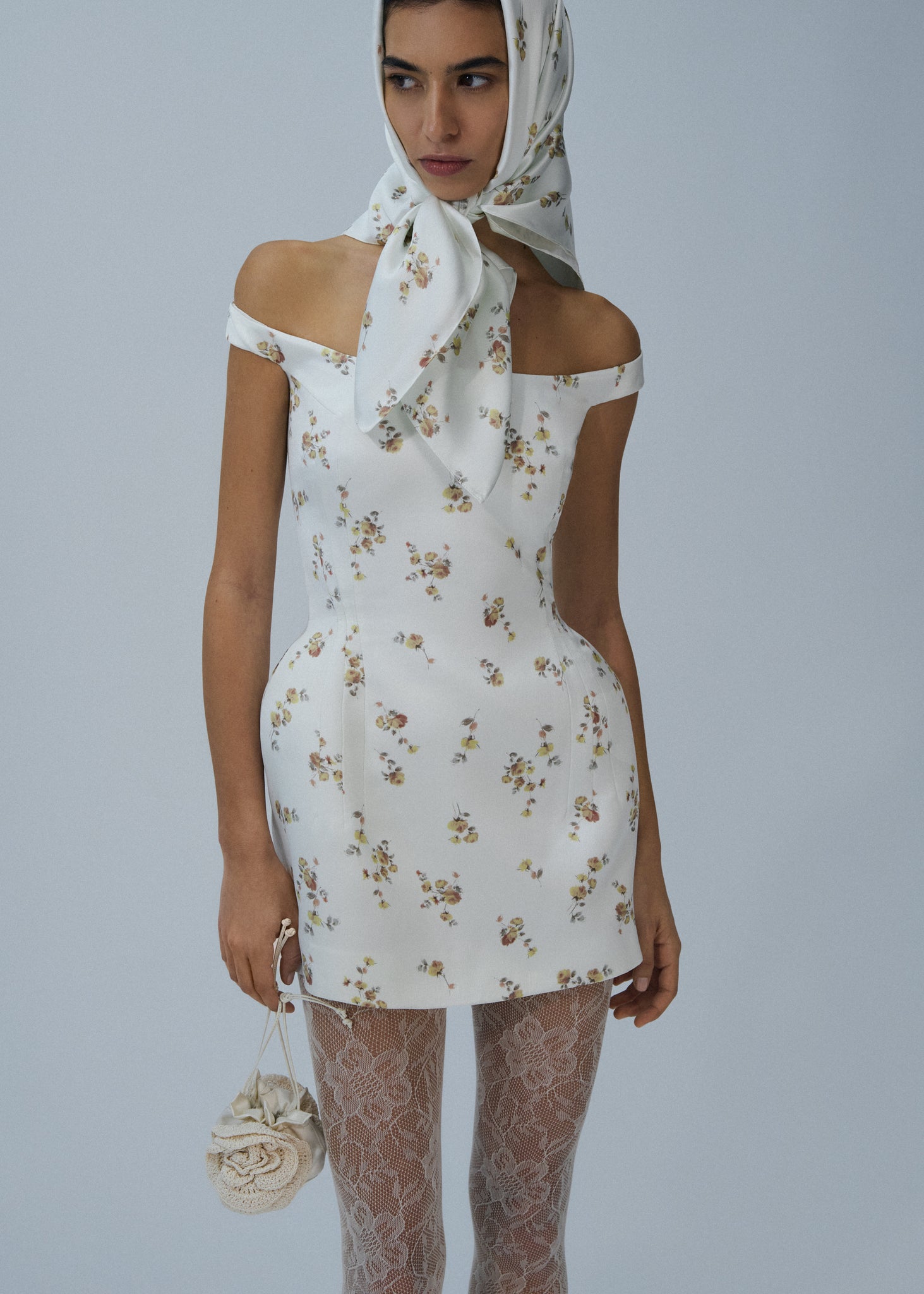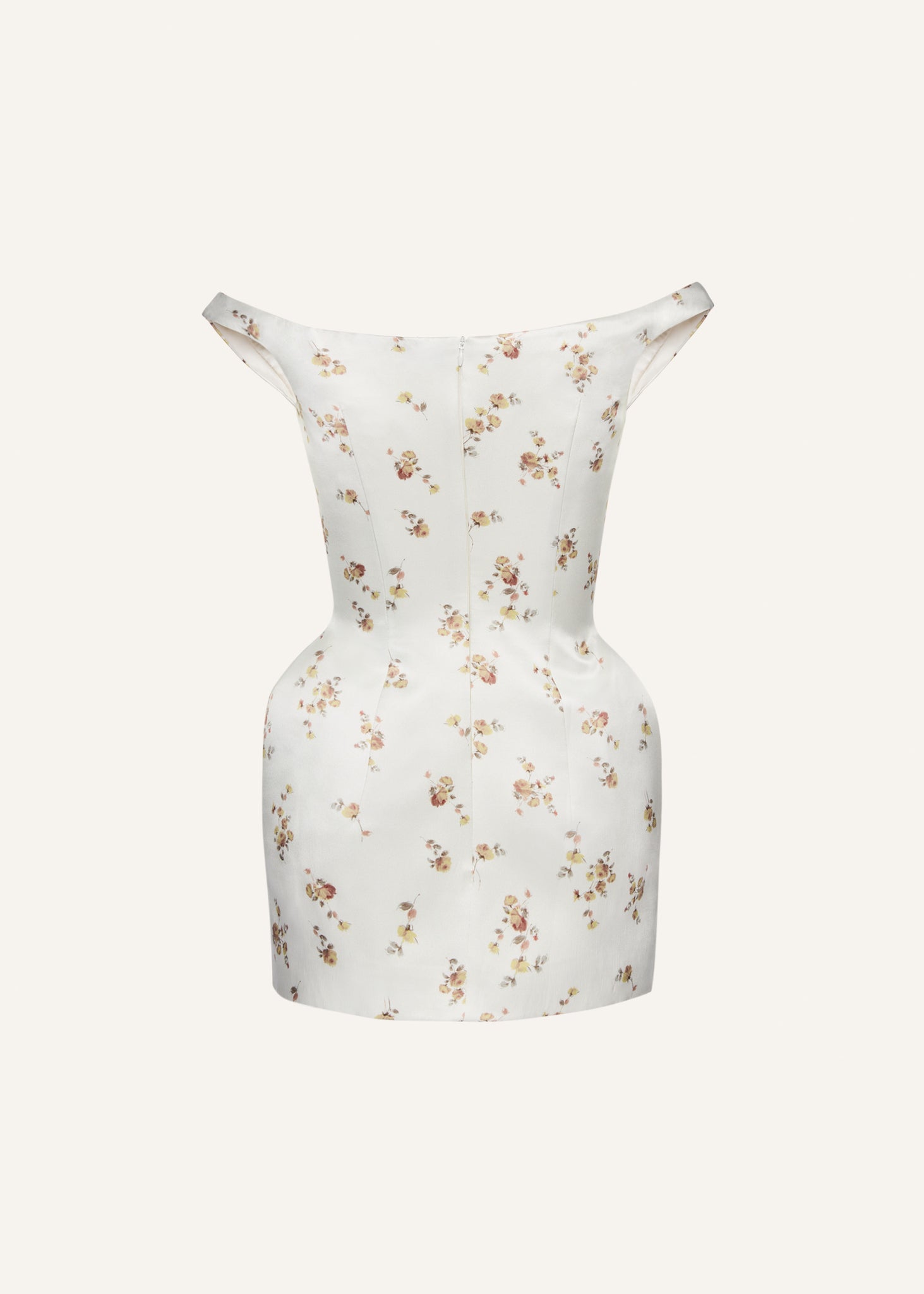 This ladylike mini dress is made from lightweight silk and creates an hourglass shape by using hip pads and a fitted bodice, complemented by a rounded off-shoulder neckline.