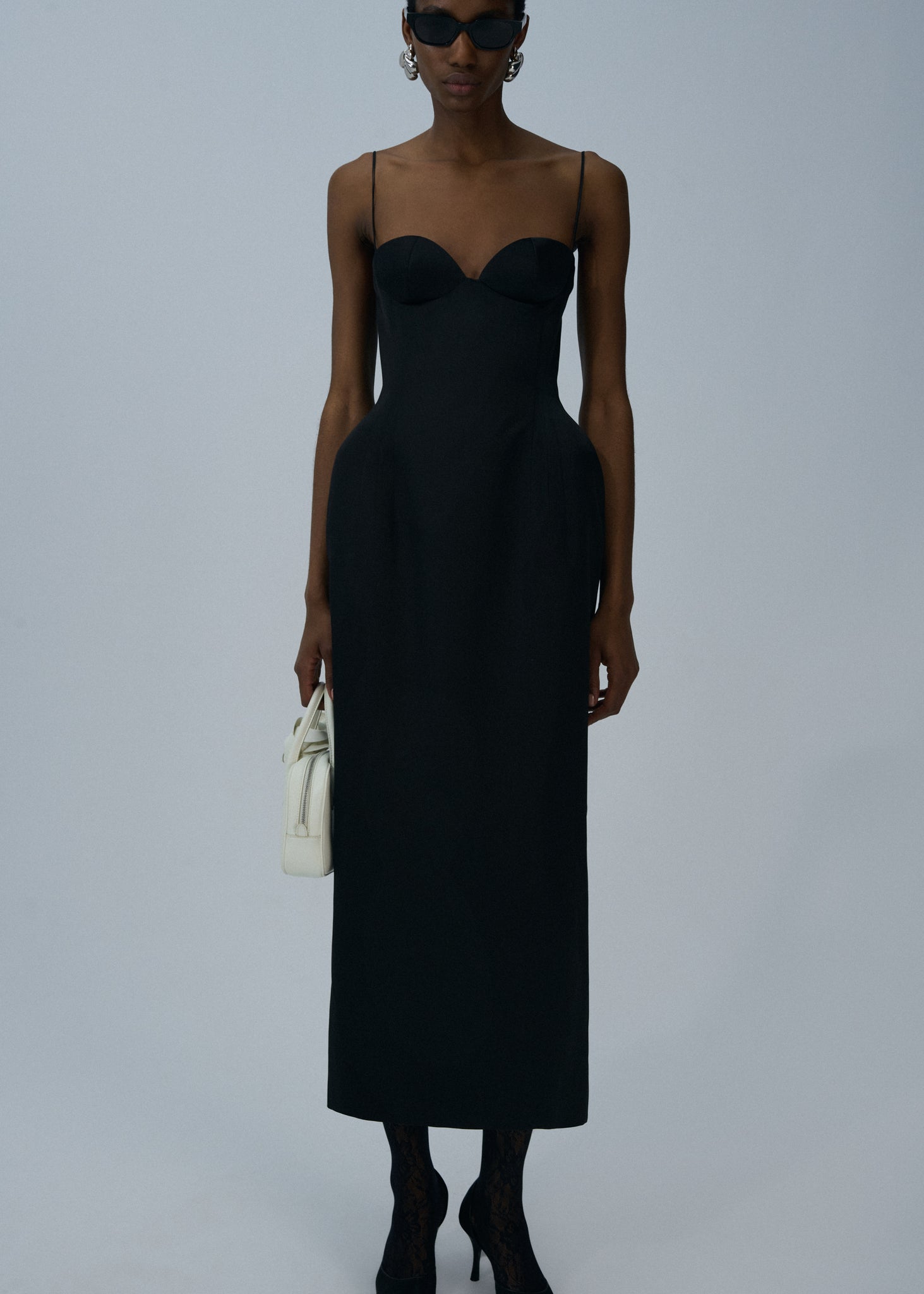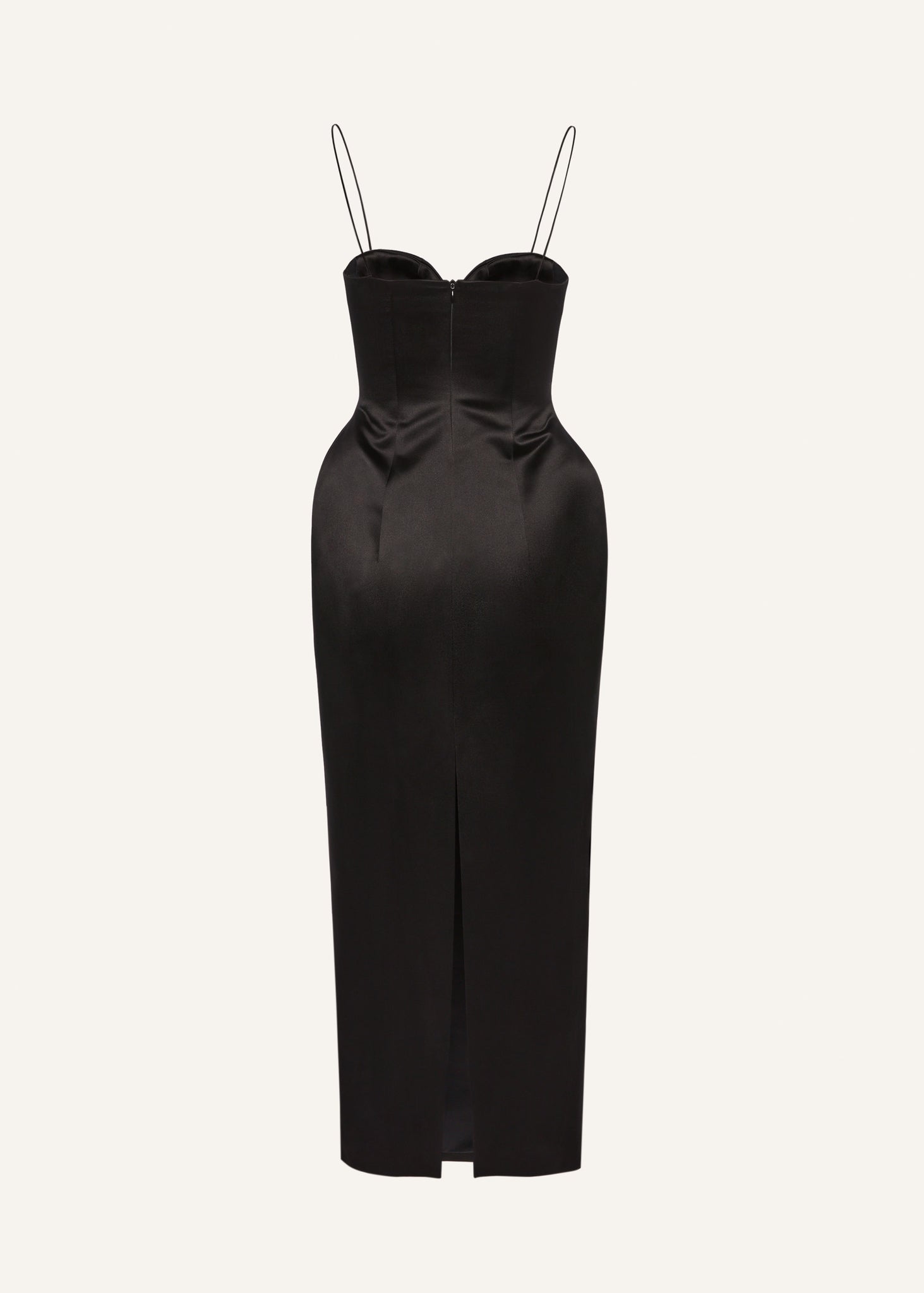 A silk midi dress with a feminine hourglass shape, created through a sweetheart bra with a fitted bodice and hip pads.
